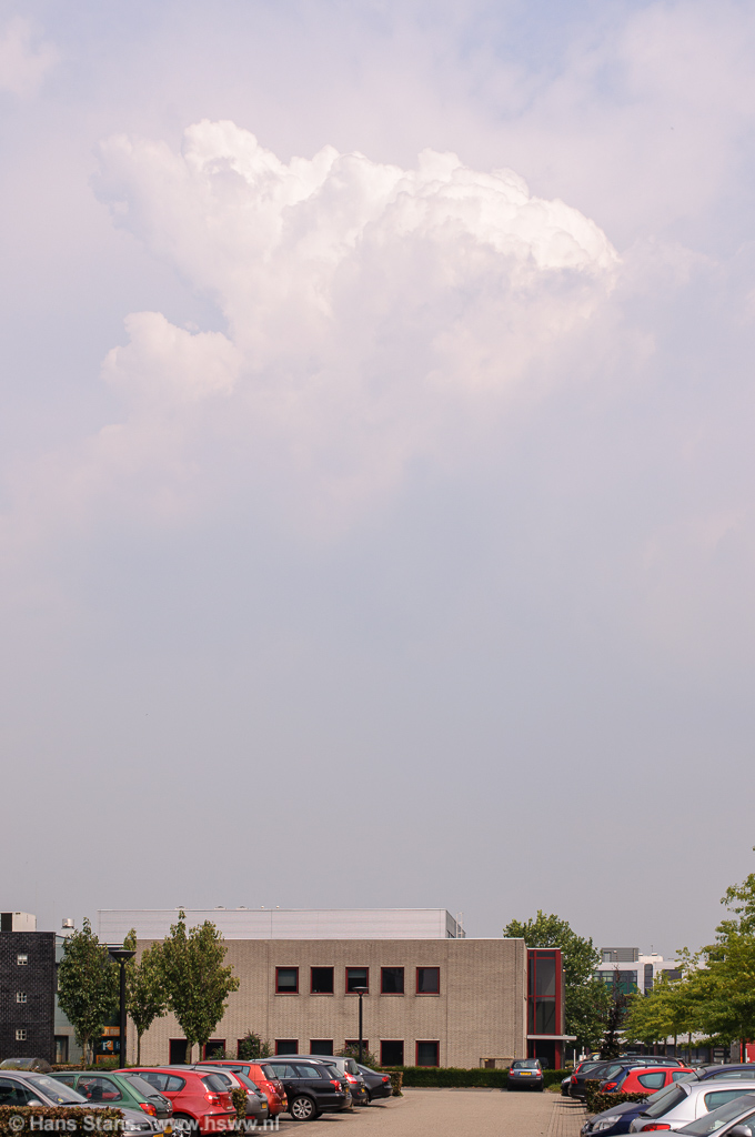 Een warme dag vandaag; temperatuur kon oplopen tot tegen, of zelfs ruim, 30°C. Over het zuidoosten was een enkel warmteonweer van het type snel ontstaan - snel weer oplossen mogelijk. Niet zo kansrijk dus, maar toen ik zo tegen 14:00 het soort taferelen hieronder vanuit het werk te Den Bosch zag was het besluit snel genomen: rondrijden in oost-Brabant/het noorden van Limburg in de hoop een onweersbui te onderscheppen.
