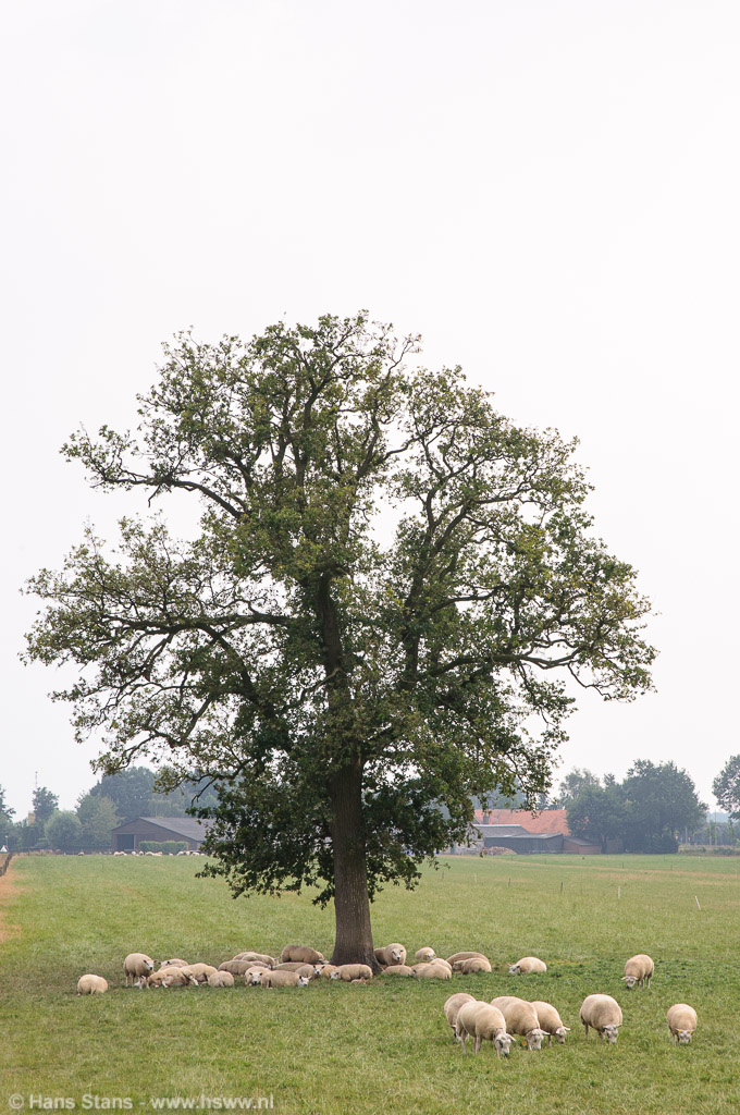 Terug een heel stuk in westelijke richting. Aan de Midden-Peelweg t.h.v. Odiliapeel het tafereel hieronder. Het was niet helder, en de temperatuur zowat 29°C. De meeste schapen zochten verkoeling onder de boom: