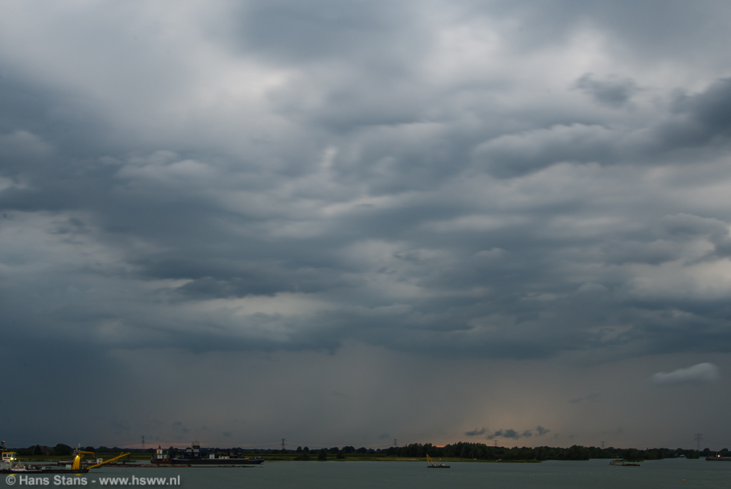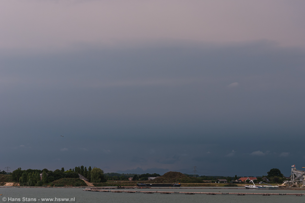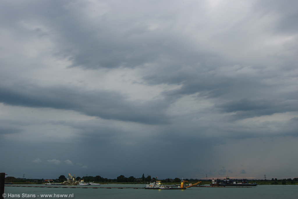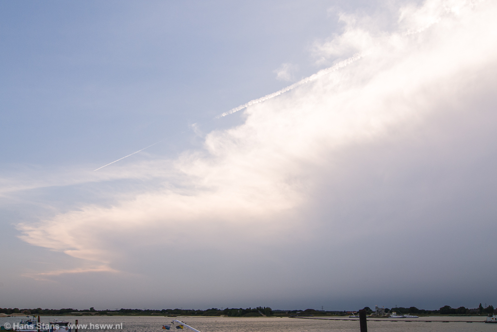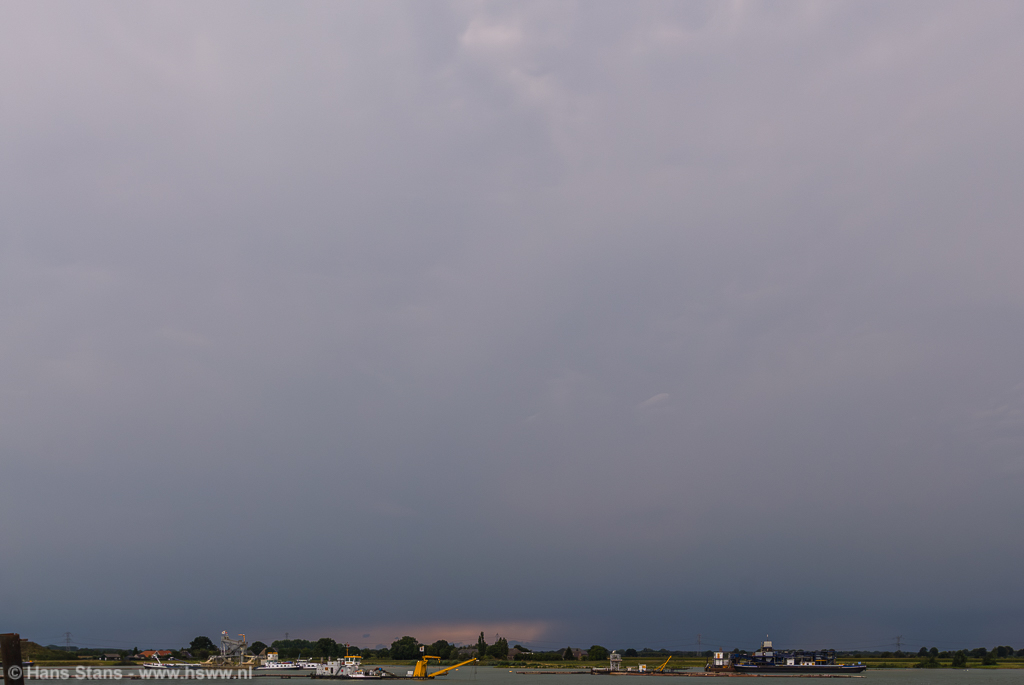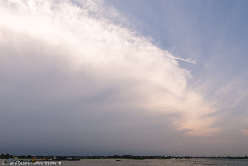 Als ik nu alleen op pad was geweest zou ik direct door het Maaslandschap (goed zicht) in westelijke richting de lijn tegemoet zijn gegaan. Ik zie de buien graag bij daglicht en hoe eerder bij de buien hoe beter, want door de voortdurende toestroom van koelere lucht en dagelijkse gang neemt de onstabiliteit af. Maar goed, samen uit en samen thuis: in meerderheid werd besloten de lijn af te wachten vanuit (de inderdaad prima) zichtpunten bij de Plassen te Cuijk. Terug daarheen dus en we zagen een imposante rij aambeelden verschijnen over de hele westelijke horizon: