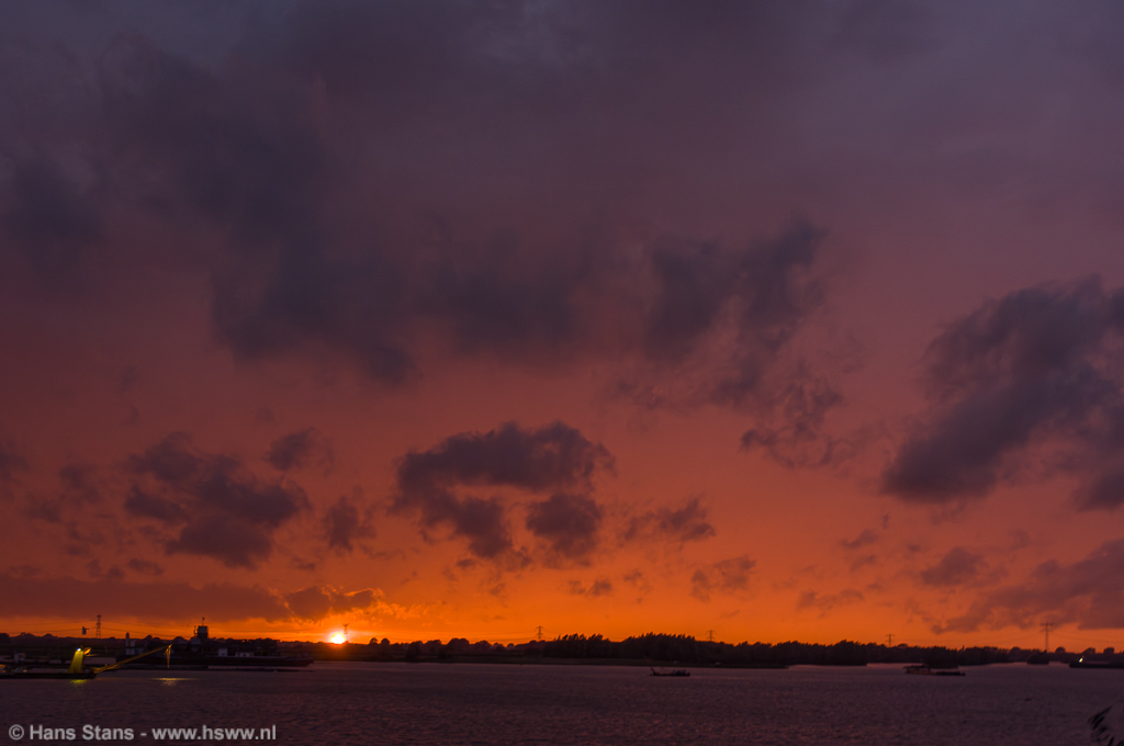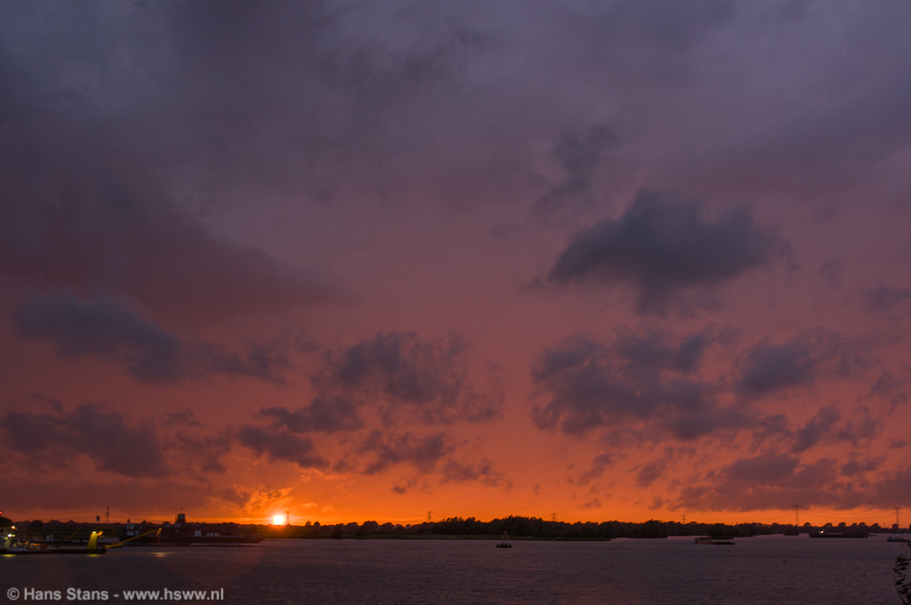 20:35 e.v. We gaan overlopen worden. De lijn is zowat gearriveerd en iets ten zuiden en net voor de lijn uit is ook een kern ontstaan. We zien nu van het Z en ZZW onweer op ons af komen, de ontladingen maar vooral de zware neerslag zorgden ervoor dat we de auto's in moesten. Het lukt me nog net wel om onderstaande foto's te nemen van de ondergaande zon die het nog net lukte om voor de nieuwe kern uit onder de lijn door te schijnen, prachtige rode kleur door de toen nog lichte neerslag: