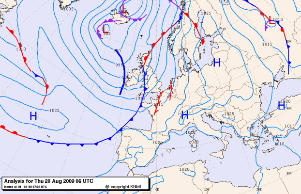 Het centrum van een hoog boven de Baltische staten trekt noordoostwaarts. Met een zuidelijke stroming wordt continentaal tropische lucht aangevoerd en boven Frankrijk bouwt een Spaanse Pluim (thetaw850 18-19 graden) op. Tussen 12 en 17 UTC trekt een thermische vore van west naar oost over ons land. Het koufront dat daarachter zit (thetaw850 13 graden) trekt tussen 18 en 00 UTC van west naar oost over ons land. Hierna komen we in een zuidwestelijke stroming terecht. Vrijdagavond passeert een (hoogte)trog ons land van west naar oost.