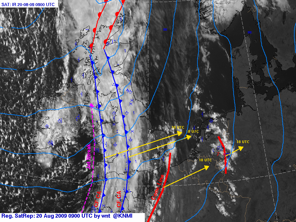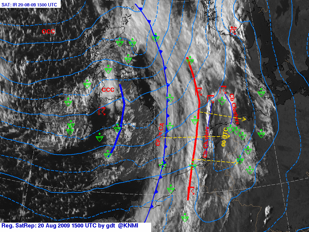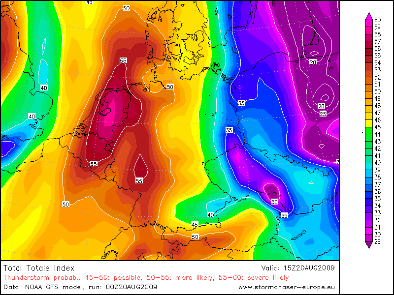 Met een zuidelijke stroming wordt continentaal tropische lucht aangevoerd en boven Frankrijk bouwt een Spaanse Pluim (thetaw850 18-19 graden) op. Tussen 12 en 17 UTC trekt een thermische vore van west naar oost over ons land, waarachter de wind naar west draait. Het koufront (dubbelstructuur: eerste front op hir06 thetaw850 van 15 graden, tweede op thetaw850 van 13 graden) trekt in de avond en nacht van west naar oost over ons land. Op het eerste koufront (thetaw850 15) zijn nog zeer zware windstoten mogelijk, pas na passage van het tweede koufront (thetaw850 13) afname dauwpunten. We verwachten dat vanaf 14:00 in het gehele land zware onweersbuien kunnen ontstaan (zeer zware windstoten tot 110 km/uur, hagel en veel neerslag).