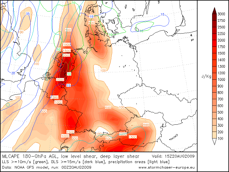 During the late afternoon and evening storm coverage should gradually increase. The activity should then spread eastward and northward into northern Germany and later into Denmark. The speed with shich this will happen is a bit unclear and differs among models.