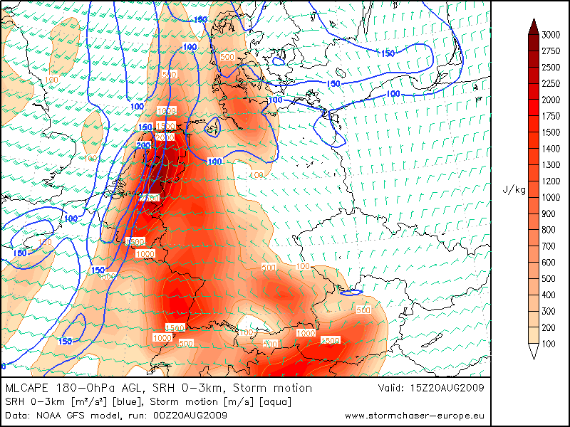 Dat zou vandaag wel eens een spraakmakende weerdag kunnen worden, niet alleen kan het erg warm worden maar de extreem-weerliefhebbers kijken natuurlijk vooral uit naar de onweerkansen. In een Spaanse Pluim situatie loopt de temperatuur en onstabiliteit in de berekeningen vooraf ver op. Verder forse waarden voor SRH en windschering maar de overlap tussen alle factoren is niet volledig en bovendien lijkt het erop dat alle buien pas vanaf middelhoog niveau gaan ontstaan waardoor i.i.g. het onderste deel van het windprofiel niet gebruikt zal kunnen worden.