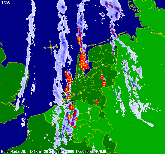 Imposant waren de zeer dichte en donkere neerslagkernen. De buien trokken over de van west naar oost trekkende lijn in NNO-richting zodat we enkele exemplaren zagen passeren terwijl de lijn langzaam naderde.