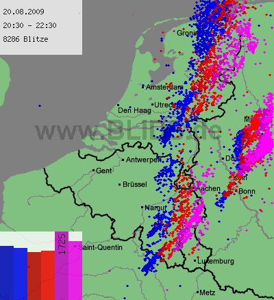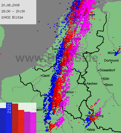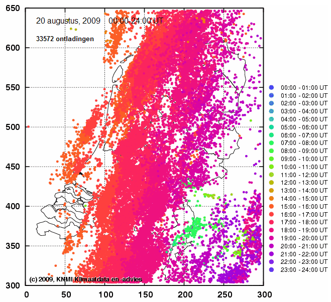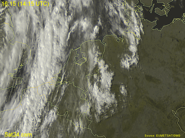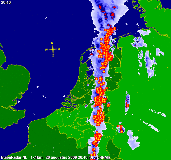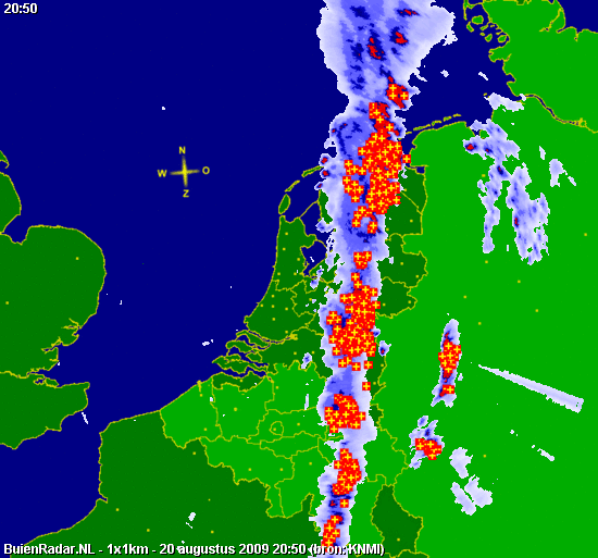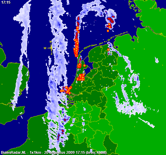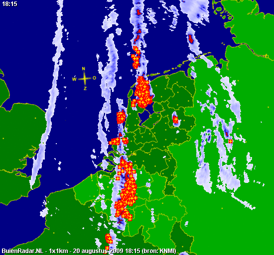 Hierboven satellietloop van 16:15 tot 20:30. Hieronder, neerslagdetectiebeeld van 19:00 tot 22:45. Mooi is te zien hoe de cellen op de lijn met de stroming NNO-waarts trekken, hoe de lijn op "ons" gedeelte langzaam inlevert en hoe bij de oosterburen (kan het ooit anders?) wel zware kernen ontstaan op convergentie voor het kf uit. (Ik heb deze animatie van iemands web-site gehaald - maar ik weet niet meer van wie en moet aldus de credits voor het samenstellen schuldig blijven.)