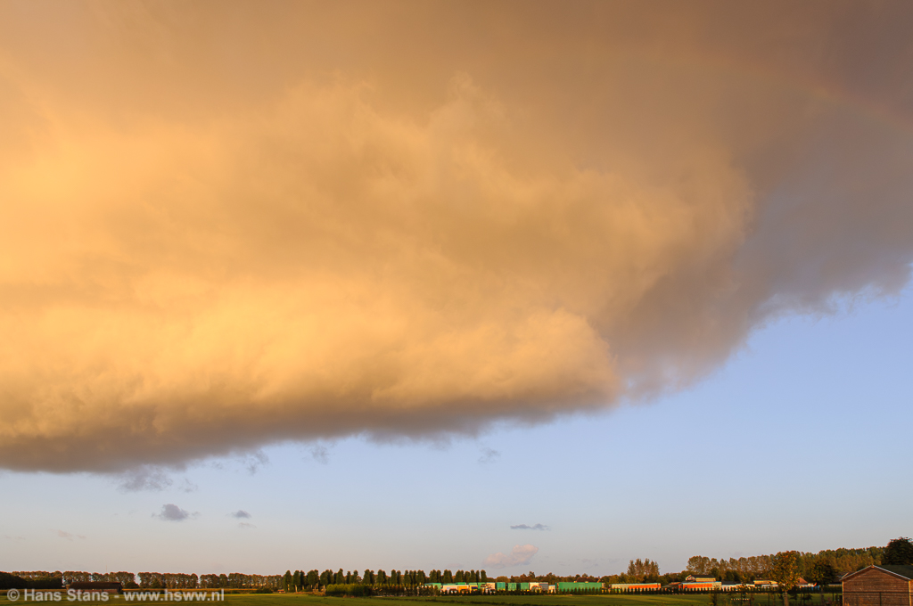 Hmm, terwijl ik toekeek leek de wolkenbasis zich toch wel wat te verstevigen... Omdat ik toch graag de regenboog nog wou proberen startte ik een mini-chase. Ik reed een paar kilometer westwaarts om het nog eens te proberen, dat ritje duurde een achttal minuten, meer niet. Eenmaal ter plekke kreeg ik meteen een stuk regenboog op de foto maar schrok eigenlijk wel een beetje van hoe de wolkenbasis zich ontwikkeld had! Ook een zeer lage wolkenbasis en het geheel werd onwerkelijk beschenen door de laagstaande zon.
