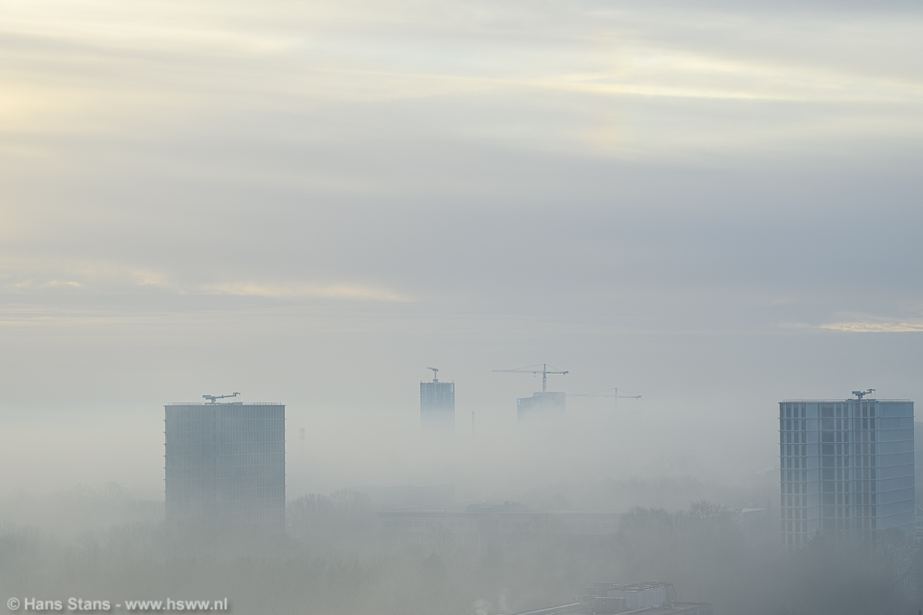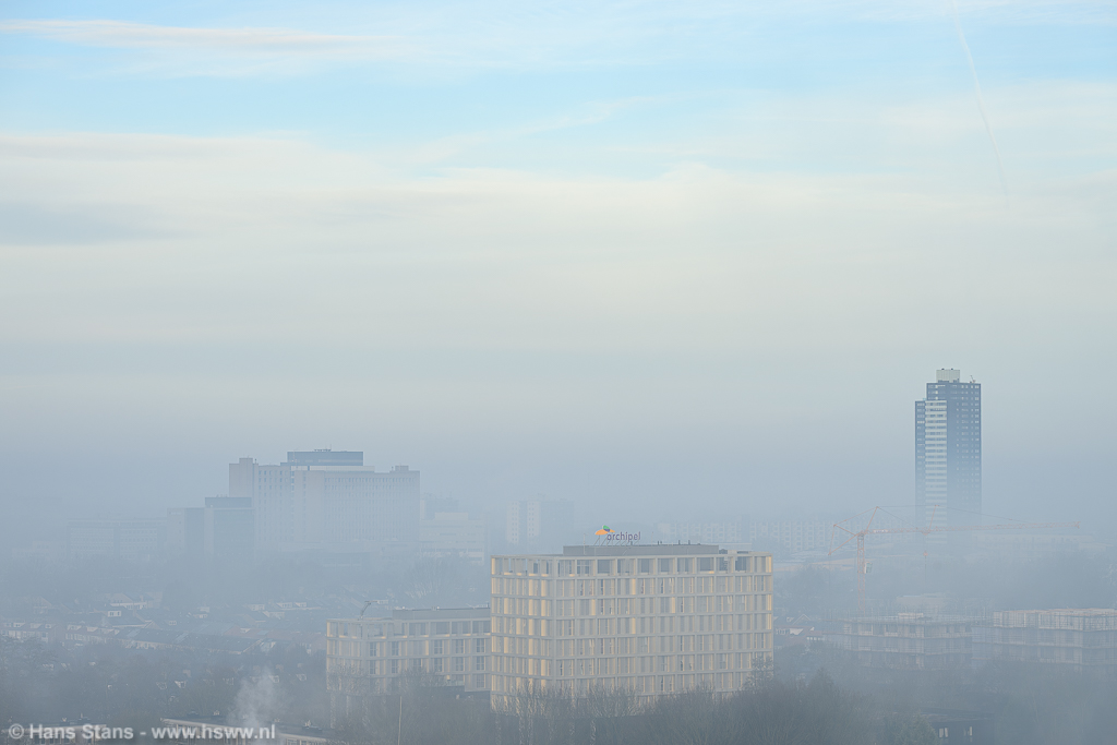 Behoorlijk mistig begin vandaag, de foto hierboven maakte ik om 08:30. Nog wat donker voor een foto uit de hand vond ik (ISO to the rescue...) dus wat later, rond 09:30 foto's gemaakt in zowel ZO als NW richting, zie hieronder. De mistlaag was niet zo dik (=hoog), gebouwen vanaf +/- 45 meter hoogte kwamen er flink ver bovenuit. Daarboven opklaringen, de zon kwam te voorschijn en de mist was vrij snel, zo rond 11:00, opgeruimd.