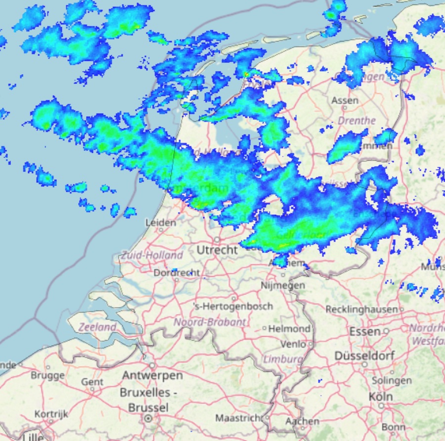 Keurig als door weermodellen berekend maken we een winters begin van 2026 mee. Na passage gisteren van een koufront behorend bij een laag over zuid-Scandinavië stroomde koude lucht in een noordwestelijke stroming over zee toe, afnemende temperatuur ook op 850Hpa en 500hPa betekende een toenemende kans op winterse, en soms felle, buien met kans op onweer en windstoten erbij. I.v.m. voortgang/positie van het front was de neerslag in eerste instantie voorbehouden voor het midden en noorden, hieronder neerslagradarbeeld 1-1-2026 om 19:00z: