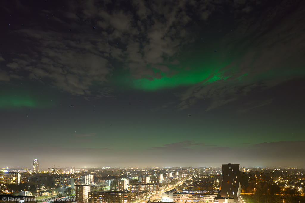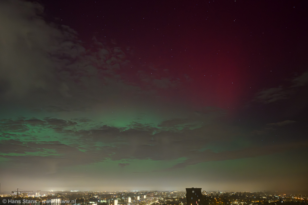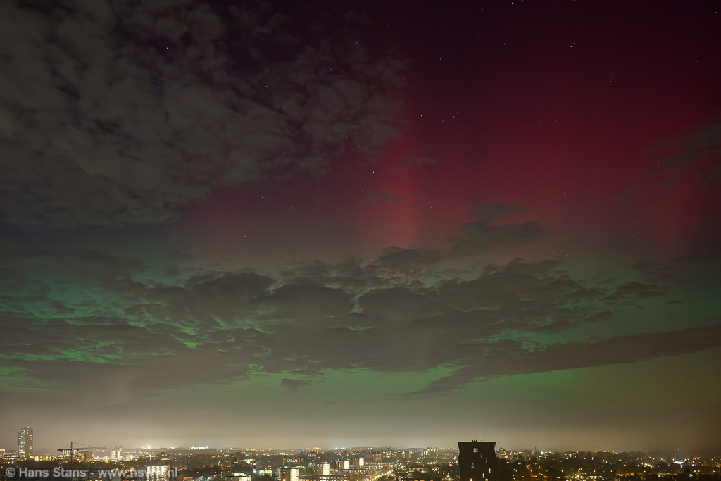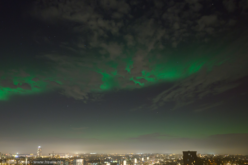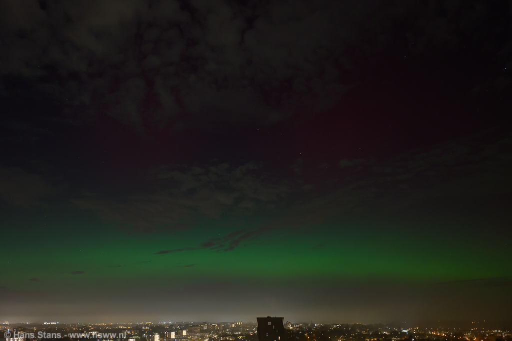 Geweldige noorderlichtdisplay vanavond als gevolg van een forse CME gisteravond. Ik kon er niet op uit - ben door m'n rug gegaan - maar ik heb ondanks dat en al het stadslicht toch nog wat op foto gekregen. Ik kan vanuit de werkkamer met groothoek alleen van NNW naar NNO fotograferen en ook niet recht omhoog en dat was alletwee vanavond niet zo handig. Bovendien (ik vind te-) veel bewolking op het beste moment.