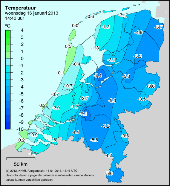 Na een uurtje ging de mist over in lage stratus. Het gebeuren leek zich af te spelen op de grens van koudere lucht die naar het westen opdrong, op het KNMI temperatuurkaartje van 14:40 is echter ook te zien dat de stratus daarna de vorst temperde: