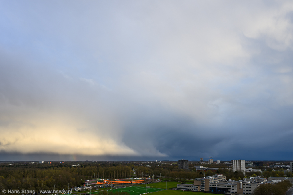 Vandaag een onstuimige dag met voormiddags veel wind en flink wat buien en buitjes (vaak kortlevend en maar kort echt actief). Hierboven: het begon 's-ochtends al goed, voordat de eerste buien arriveerden kon de opkomende zon ze nog flink aanschijnen en dat leverde alvast een lekker breed regenboog fragment op.