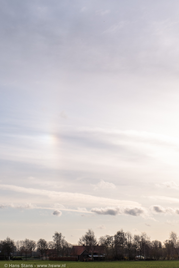 De dag begon echter zeer rustig, vrijwel onbewolkt met slechts een weinig cirrus. Zo na 08:00 begon er bewolking op te komen van het westen, deze werd voorafgegaan door wat dikkere cirrus. In de autospiegel zag de zon weer zo typisch zilverachtig omfloerst uit, en ja hoor, bijzonnen waren zichtbaar! Op de eerste foto een niet zo uitgesproken getekende linker bijzon:
