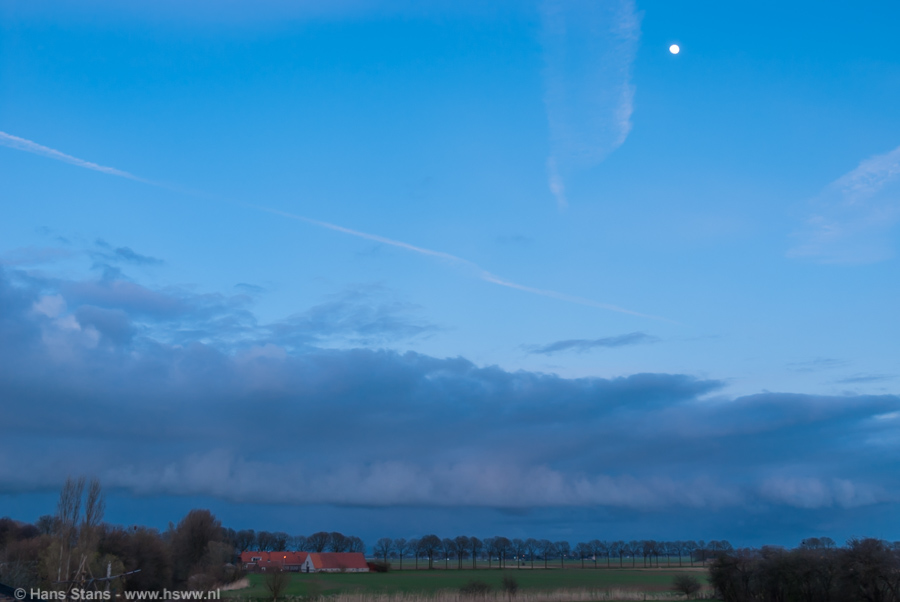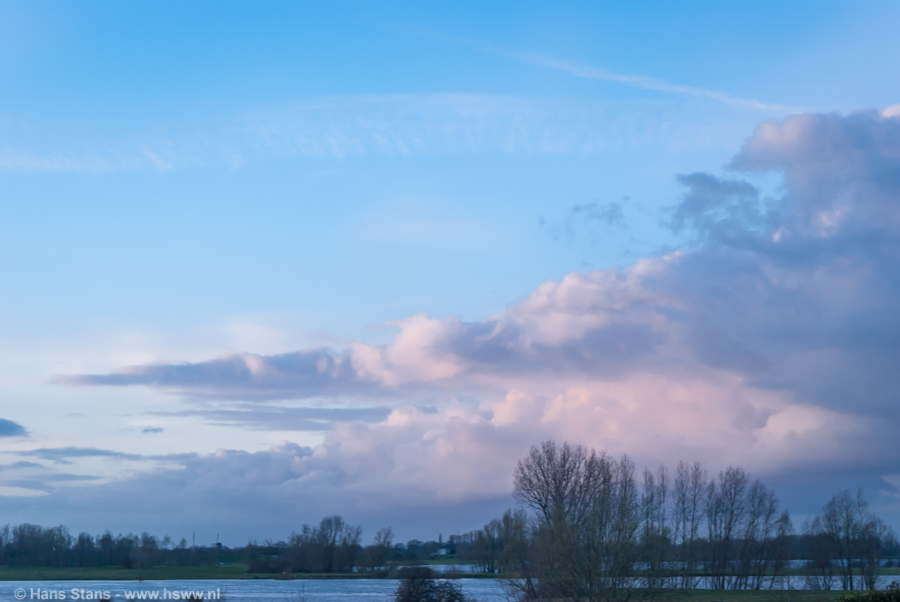 Ik zag van andere fotografen mooie witte buienwolken tegen een blauwe hemel met fraaie capillatus koppen. Bij mij in de regio was dat helaas niet te zien, maar na het werk toch maar even langs de Maas gegaan voor een paar foto's. Dat leverde de volgende beelden op, alle gemaakt tegen zonsondergang te Gewande, een klein plaatsje aan de Maas vlakbij Den Bosch: