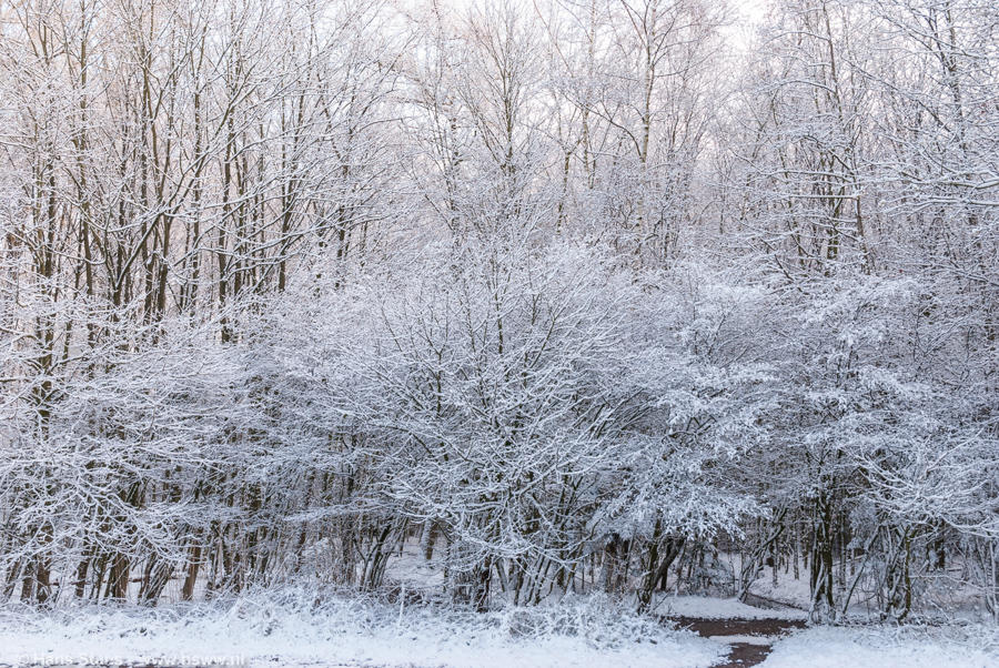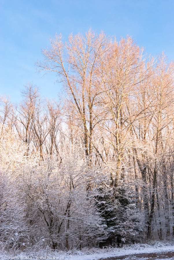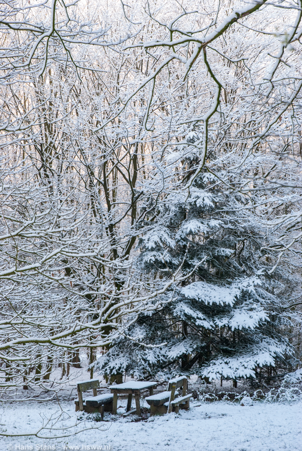 Om tien over half acht arriveerde ik het Wijbosch Broek, het klaarde mooi op en de laagstaande ochtendzon stond met van die mooi bleke ochtendkleurtjes door en op de besneeuwde takken te schijnen. Ik besloot toen om niet 'gewoon' sneeuwfoto's te nemen (zeg maar met de zon in de rug) maar juist dat ochtendlicht een rol te laten spelen. Dat maakte het fotograferen wel lastiger, de zonsopkomst is vaak al een strijd tegen de overbelichting, en nu zijn ook nog eens de 'donkere' stukken wit. Daarbij moet sneeuw altijd ruim belicht worden om te voorkomen dat het er blauw of blauwgrijs uit gaat zien... Ik moest me dwingen om niet alleen met mijn camera-settings in de weer te zijn (Nikon-discussies noem ik dat) maar ook nog 'gewoon' van het bos te genieten. Wat zag het er mooi uit! Ik hoop maar dat het gelukt is die sfeer enigszins in de foto's te verwerken: