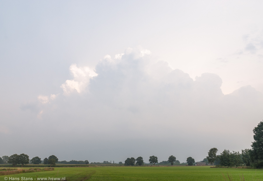 20:41 Op Weerwoord.be wordt het vermoeden geuit dat dit een supercell betreft. Ik begin op dat moment een halfslachtige poging om weer voor de bui te komen, maar (te) kleine weggetjes met te weinig vrij zicht en dat met de treksnelheid van de cel. Bovendien zit ik op de westflank en heb ik het idee dat de bui begint in te leveren. Ik stop voor een sfeerplaatje, hier strekt het aambeeld wel weer erg ver over me heen. Ik besluit terug te gaan naar m'n uitgangspositie om de achterkant van de bui te zien.