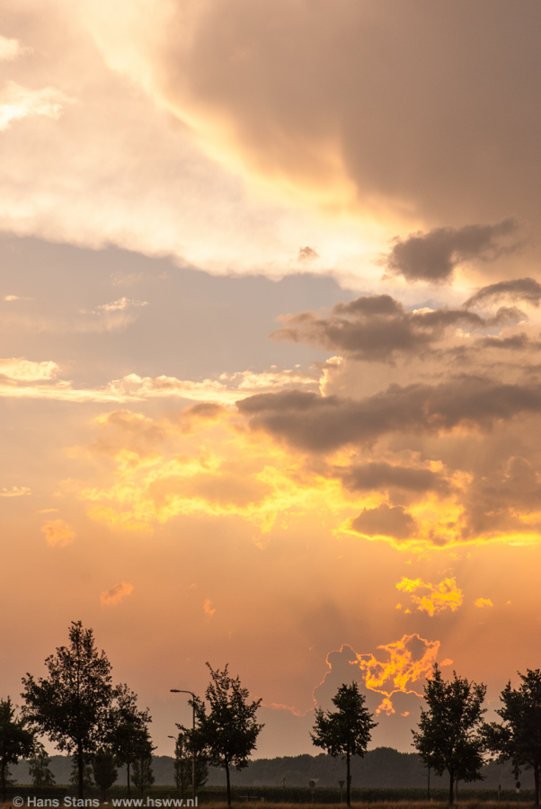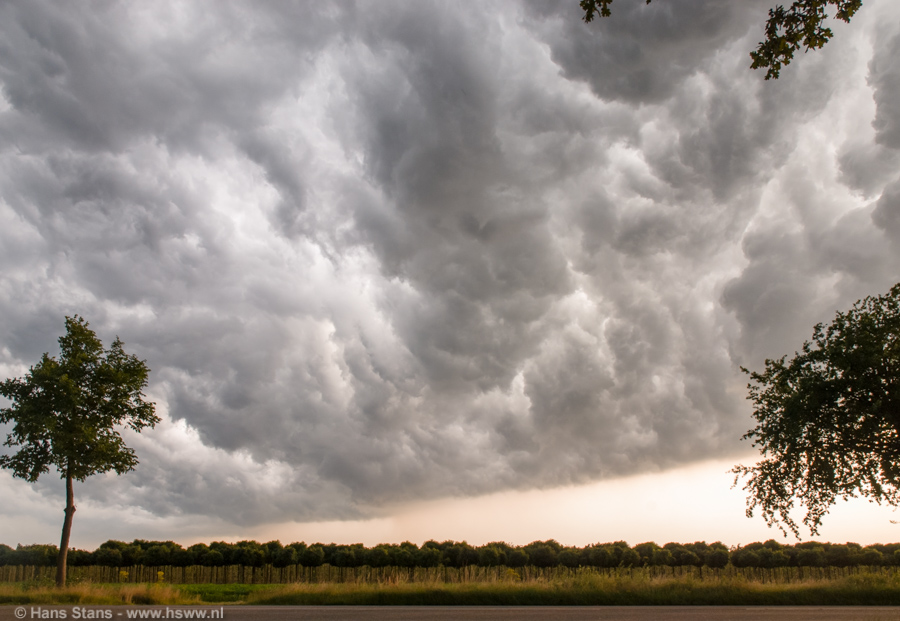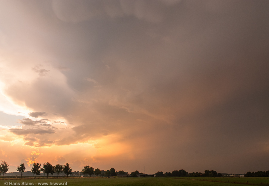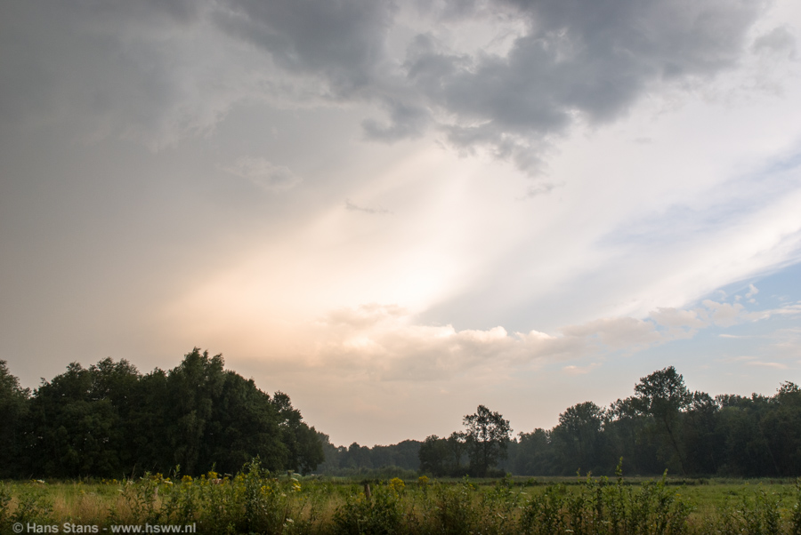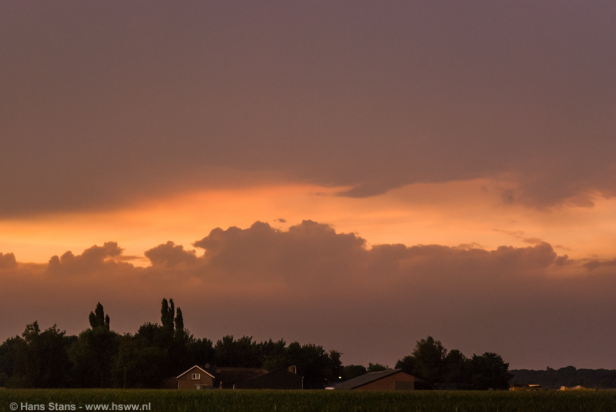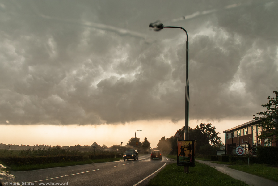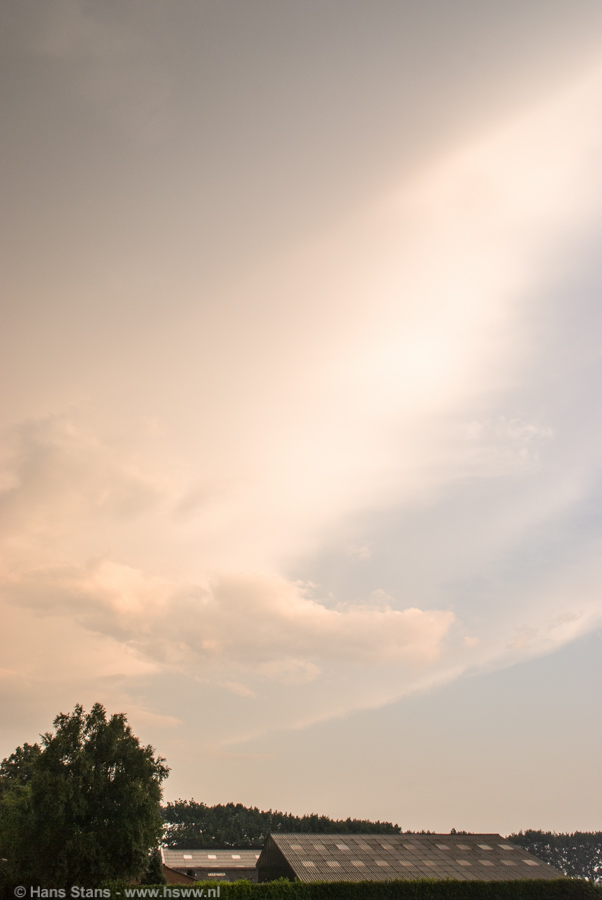 20:14 Gelukkig heb ik snel een plekje met goed zicht tussen Oisterwijk en Udenhout in kunnen vinden. De bui komt echt op snelheid op me af, alle foto's totdat ik weer aan het rijden ga zijn in 4 minuten gemaakt! Met de dynamiek, de laagstaande zon, de onmogelijke contrasten en alles handmatig instellen van de camera viel dat nog niet mee... Er was ook nog een tweelaagse shelf te zien, het is me niet gelukt dat nog goed vast te leggen. Er was erg veel vocht voorhanden en de kennelijke condensatie juist voor de shelf uit zorgde ervoor dat het geheel a.h.w. in mist werd gehuld. Wie goed kijkt kan de lagen van de shelf net zien op deze foto: