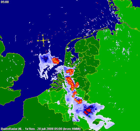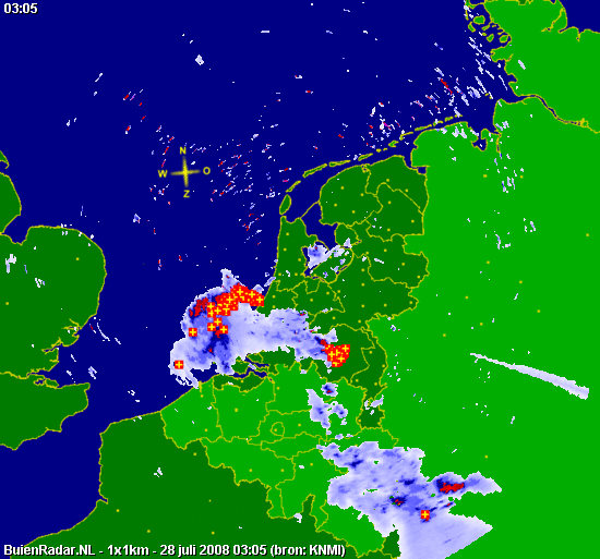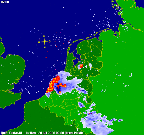 De dag hiervoor was het erg warm en benauwd geweest, in de nacht van de 27e naar de 28e zou op een convergentielijn het nodige onweer verkoeling moeten brengen. Dat onweer was er wel, maar in veel mindere mate dan verwacht (of door de onweerliefhebbers gehoopt). De minimum temperatuur zou hier zo'n 19.7°C bedragen met een hoge luchtvochtigheid, een benauwde nacht dus, ondanks dat er hier wel een paar onweerskernen overtrokken. Deze buien hadden een niet zo hoge ontladingsfrequentie van 6 tot 8 per minuut, maar gingen wel gepaard met felle neerslag en forse windstoten. Het was voor mij nog een heel gedoe, want zo rond 03:00 bleek dat maar liefst drie van onze dakramen lekten dus liep ik rond te rennen met emmers en dweil... 😀