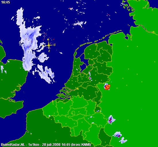 16:45 Op dit neerslagradarbeeld valt natuurlijk als eerste het onweer boven Noordrijn-Westfalen op. Interessanter voor mij echter zijn de celletjes boven Rijnland-Palts die ik al een uurtje zit te volgen, ze groeien gestaag en trekken erg langzaam noordwaarts. Verder is er boven het uiterste Zuid-Limburg een pitje ontstaan dat daar redelijk stationair blijft staan.