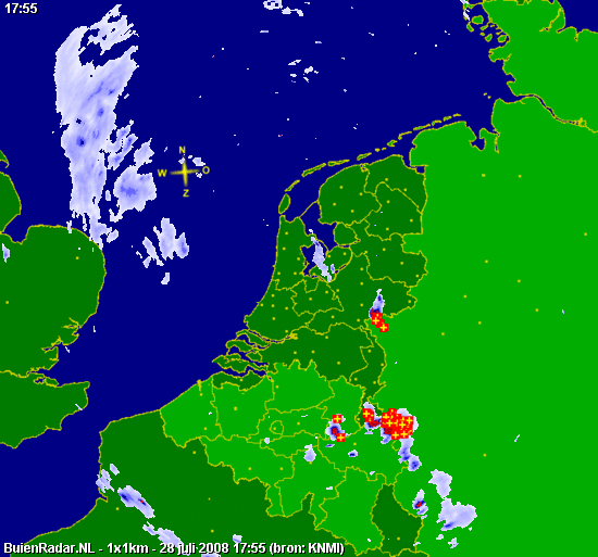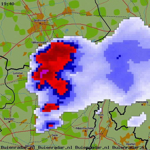 18:20 De samenvoeging is nu volledig, er staat nu een massieve cel boven het uiterste zuiden van Limburg, deze zal een NNW koers gaan nemen.
