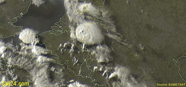 19:30 Ik kan vanuit m'n tuin een enorme ijskap in het zuiden zien staan, dit betekent nu ook uit eigen waarneming dat het om een zeer forse cel moet gaan! Ik meld om 19:36 "chase on" en vertrek. Hieronder een tweetal beelden van het moment dat de cel Brabant introk, op het satellietbeeld is heel fraai een overshooting top te zien.