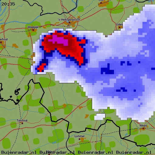 20:32 Melding op Weerwoord.be uit Udenhout: hagel van 3cm. Dat hoeft niet in tegenspraak te zijn met mijn waarneming, ik sta namelijk net westelijk van de zwaarste neerslagkern, zie het radarbeeld hieronder.