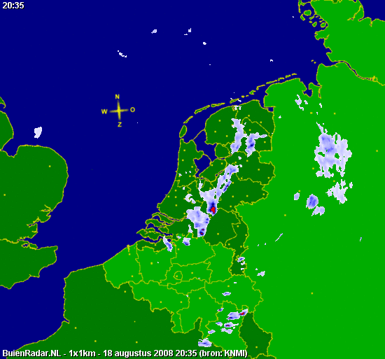 Ik was door gisteren dus extra waakzaam en toen zo rond half negen in de avond enkele buien naderden kon ik het niet laten om er toch maar op uit te gaan ondanks dat het snel (te) donker werd. De beloning was een onverwachts mooie en forse arcus (in deze vorm: shelfcloud) waarvan ik nog net een paar foto's kon nemen. Mijn positie was daarbij juist zuidelijk van de meest intense neerslagpit op het Buienradarbeeld hierboven.