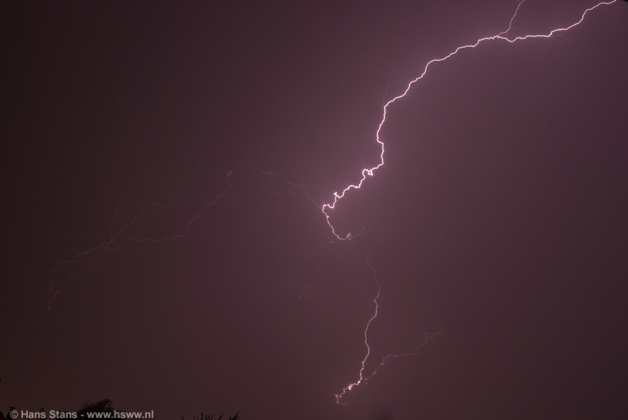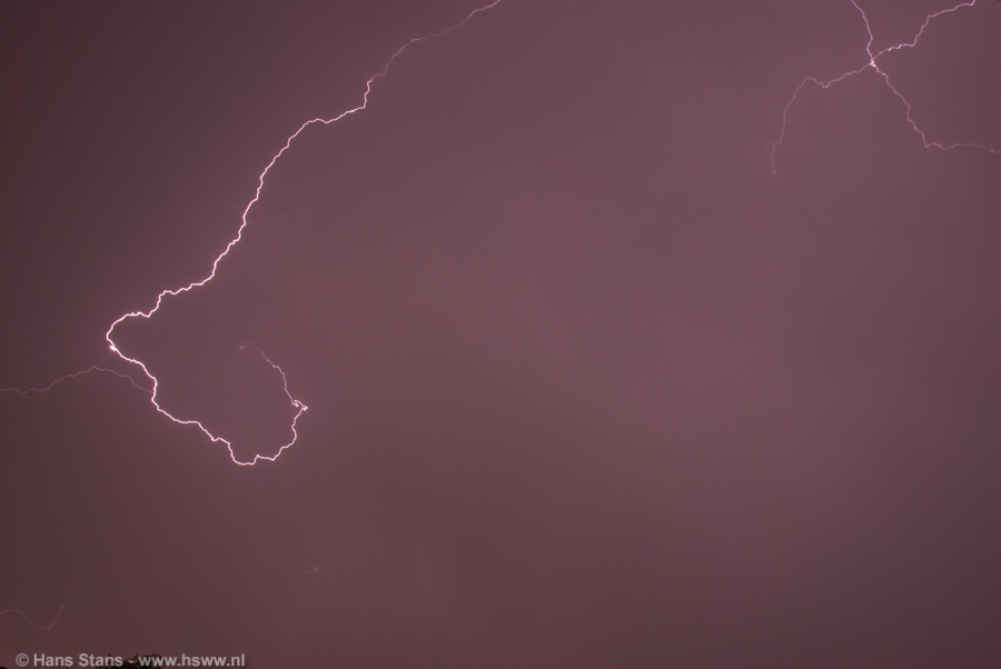 21:51 Zo rond 20:45 eindelijk rustig thuis, na een uurtje wordt m'n woonplaats aangedaan door alweer een krachtige onweerscel. Deze wordt vooraf gegaan door een prachtig gekromde arcus, maar helaas te donker om te fotograferen en ik had de cam al beneden op statief klaarstaan. Omdat ik me realiseerde dat ik dit jaar nog amper bliksemfoto's had gemaakt daarmee aan de gang gegaan, maar ik moest eerst wachten gezien de zondvloedachtige neerslag. Als je ook maar even een deur durfde te openen was het net of iemand een volle emmer water naar binnen gooide! Daarom wat foto's vanuit huis gemaakt meer zat er amper in omdat ook deze cel weer enorm snel verder trok en de ontladingen toch alweer op afstand plaatsvonden.