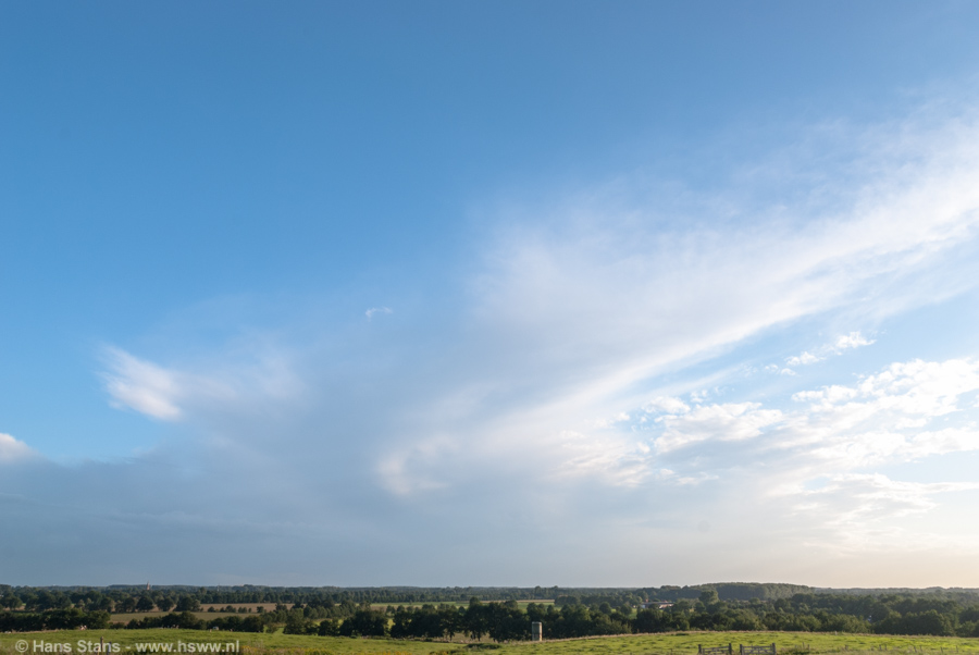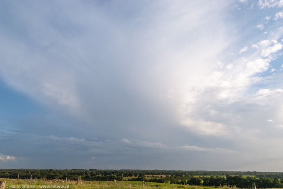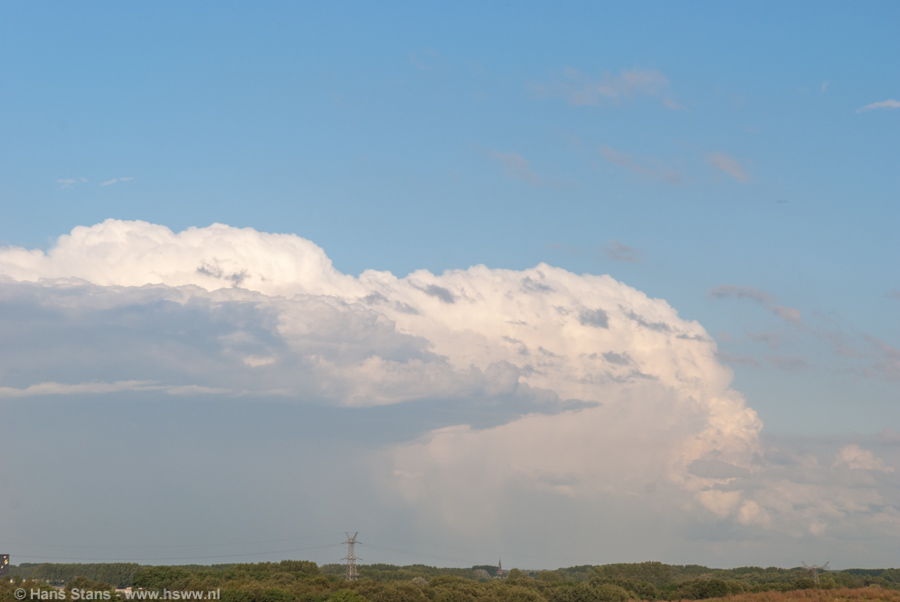 Ik besluit dan maar de (op zich erg mooi uitziende) eerste convectielijn te gaan fotograferen. Achteraf een foute beslissing, maar ik wist toen niet dat de gemiste cel ten ZW direct gevolgd werd door nog een (wat later bleek) supercell! Die had ik misschien dan nog net wel kunnen onderscheppen... Maar goed, hier wat plaatjes van een cb die wel erg ver voorover is geblazen: