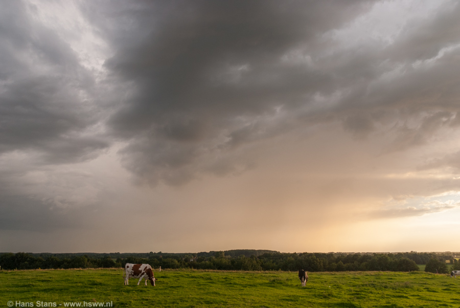Vanuit het ZW nadert er alweer een cb, al ziet deze er wel verwaaid en minder vitaal uit. Deze blijkt aan de noordkant van een volgend complex te staan met in de uiterst zuidelijke punt weer een zeer krachtige cel! Weerwoorder Ruben uit Neeroeteren (B) zou even later prachtige foto's van de meso van deze cel plaatsen. Een uurtje later is de cel bij het passeren van de Duitse grens gefotografeerd met een meso en een forse wallcloud. Conclusie: supercell!