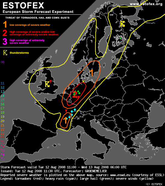 Overigens zou dit nog gewijzigd worden in een update op 12 augustus zelf om 16:53 LT, waarbij de kans op extremen minder zou zijn i.v.m. onvoldoende onstabiliteit, het level-2 gebied werd eruit gehaald en het level-1 gebied werd verkleind en meer oostwaarts gelegd.