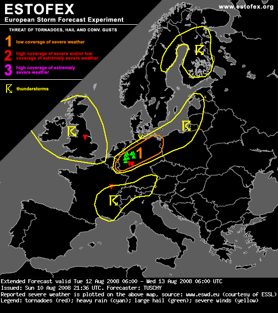 Estofex voorzag in de extended forecast van 10 aug. voor de noordelijke helft van Duitsland een goede kans voor onweersbuien om supercells te worden met enige kans op tornado-vorming gezien LLS en SRH waarden.