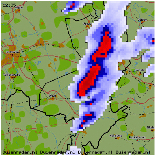 12:41 Voorbij Someren-Eind geef ik het op, omdat een tweetal bomenrijen het uitzicht in oostelijke richting blokkeert kan ik alleen nog maar recht vooruit een foto van de achterkant van de cel maken. Een zeer indrukwekkende en duistere stijgstroom staat los van de neerslag en rijst bijna recht omhoog. Ondanks dat door de windschering alle tot nu zichtbare cb's voorover lijken te hangen bezit deze een enorm dikke 'back-sheared anvil'. Daar moet toch een power inzitten, dit bleek dan ook de cel te zijn waarvan Karim Hamid om 12:09 op Weerwoord postte: de cel (o.a) over Belgisch Limburg is een low topped supercell met hook-echo en rotatie op doppler... Precies aan de andere kant van het kanaal hier is een heel dicht neerslagscherm te zien en na een paar rode flitsen hoor ik diepe donderslagen...