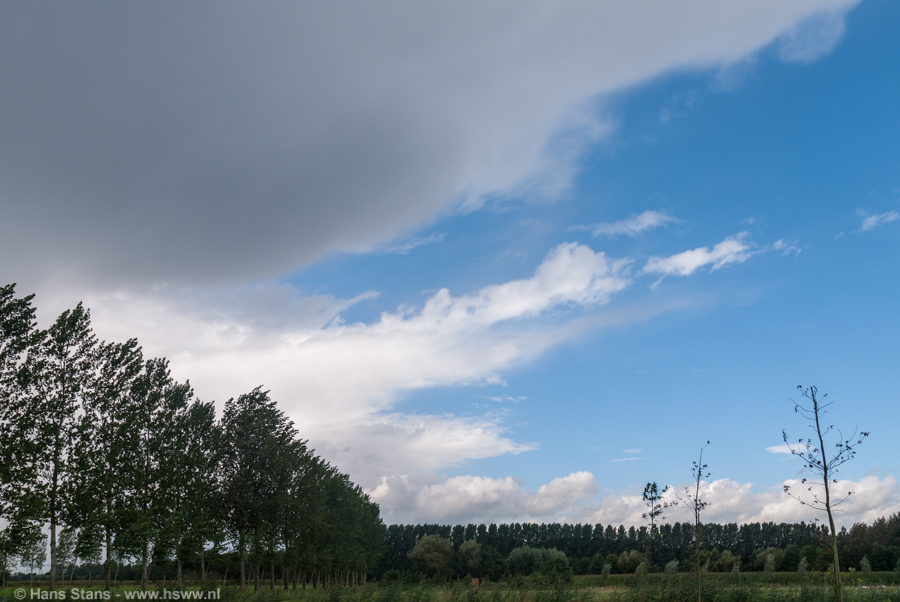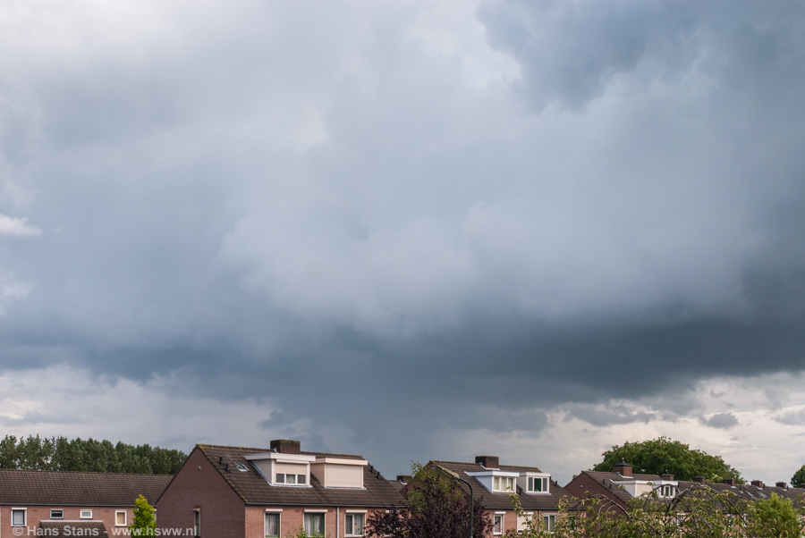 Terwijl ik de nu wegtrekkende bui bekijk draait de wind ineens naar me toe en er vallen een paar dikke druppels. Achter me nadert een volgende bui die wel een (flink) aambeeld heeft gevormd. Met een blik op de naderende neerslag besluit ik dan maar huiswaarts te gaan.