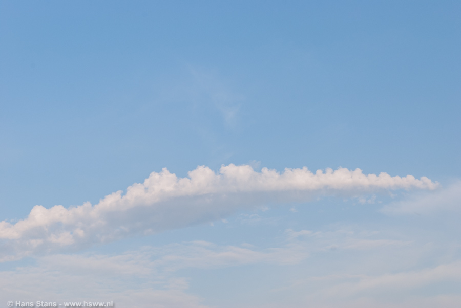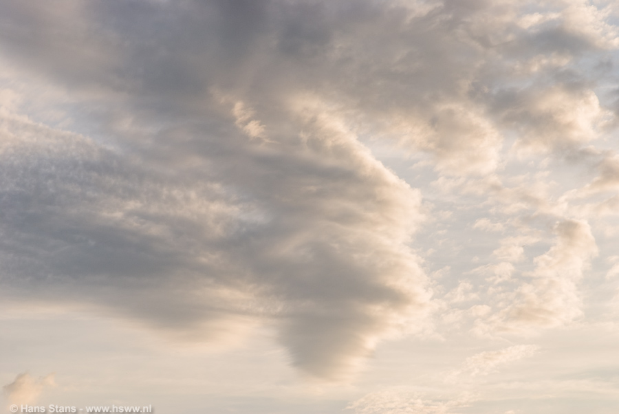 Eerlijk gezegd had ik er maar weinig vertrouwen in dacht dat alleen buien op dat front tot het uiterste zuidwesten van NL zouden reiken. Voor de middag werd het al snel warm en het voelde ook best vochtig aan. Ik zag nog in het ochtendlicht al een opvallend teken. De lenticularis-achtige verschijning hieronder trok langaam NO-waarts terwijl de wind er bijna haaks opstond! Ik vond het een echte rotorwolk.