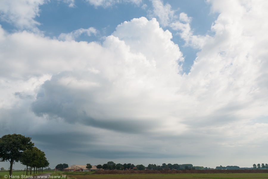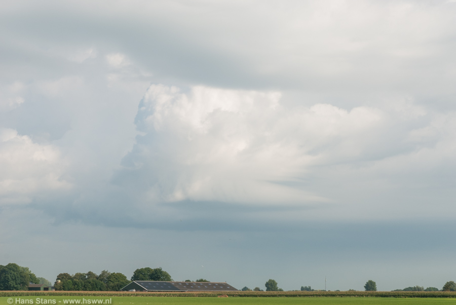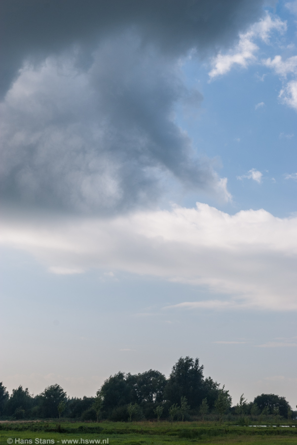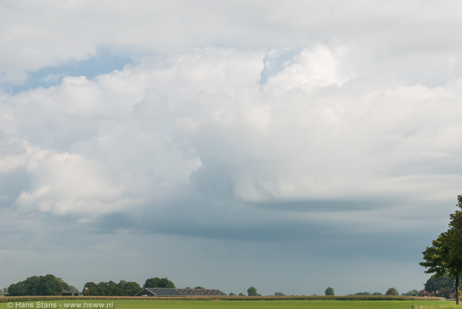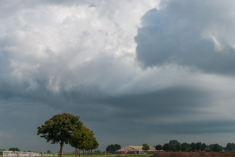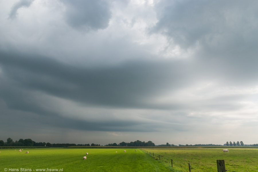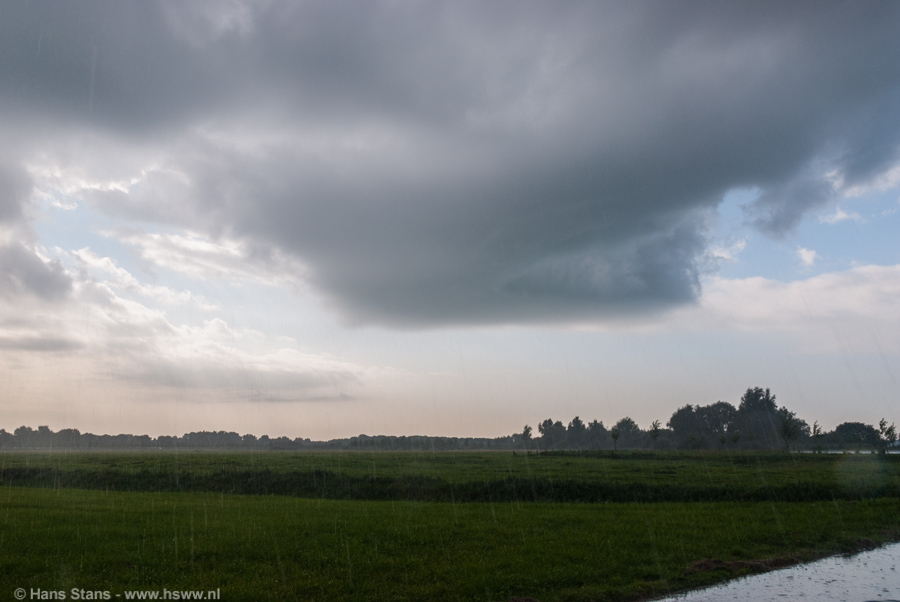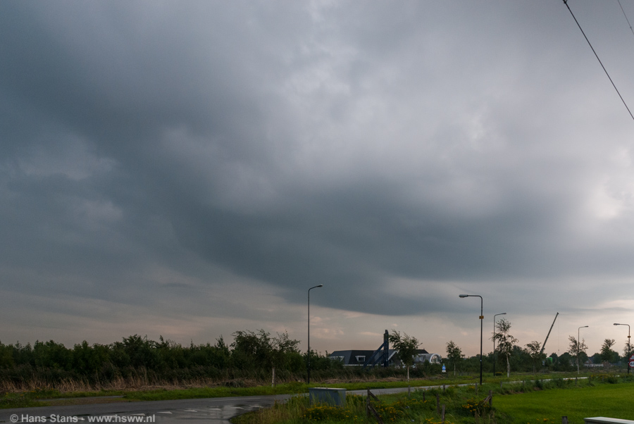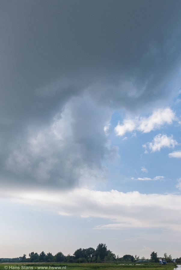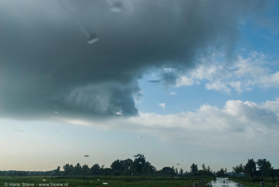 Als ik onderweg ben en in de buurt van Den Bosch de cel voor het eerst op afstand zie ben ik opgetogen, wat een mooi ding! Een beetje op een LP-cel lijkend, lage, diep blauwgrijze gladgewelfde wolkenbasis, vrijstaande updraft en een smalle maar intensief uitziende neerslagsluier aan de 'voorkant' (in de trekrichting). Toch durf ik niet te stoppen voor alvast wat foto's, bang als ik ben iets te missen!