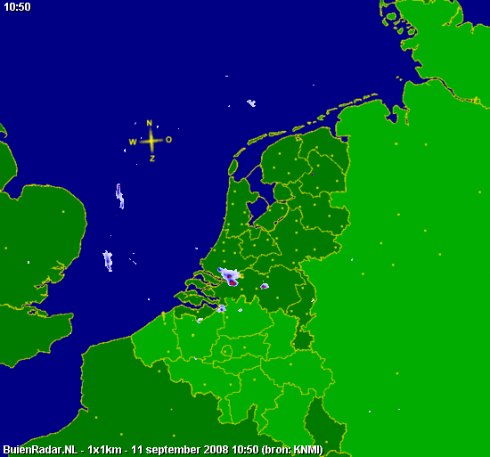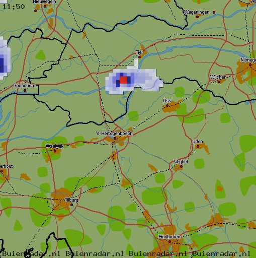 Halverwege de ochtend verschijnt er midden-Brabant een piepklein NO-waarts reizend celletje op de neerslagradar (op het radarbeeld met meeste rechtse exemplaar):