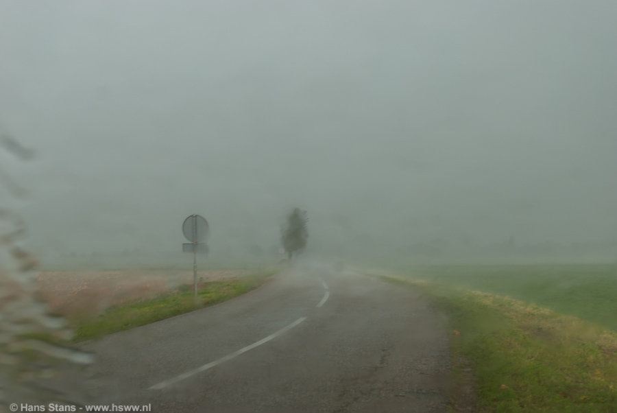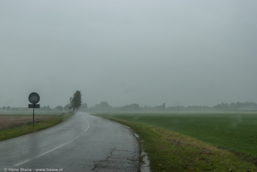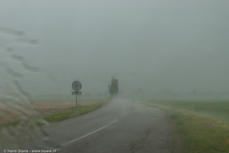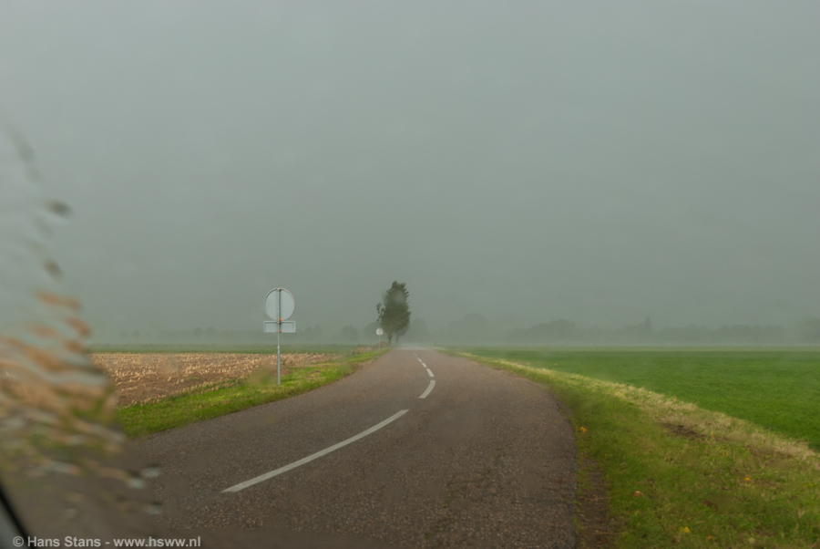 Nu in de neerslag, maar er valt nog wat zonneschijn voor me. Ruim 100 meter verder is bij de boompjes de grens van de hevige neerslag op de weg te zien: