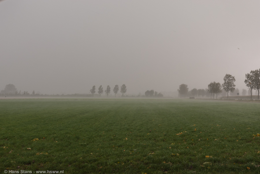 Een foto vanuit het zijraampje van de wind af. De regenvlagen bewegen over het veld als golven op water, alleen dan veel sneller: 😀