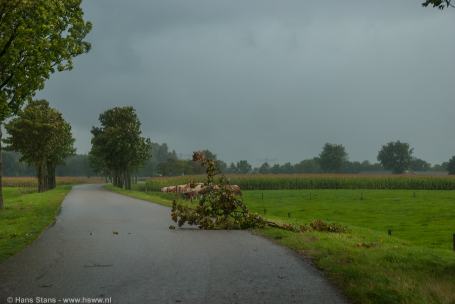 Direct na de passage. Soms dikke takken op de weg, deze moest ik aan de kant slepen en was bijna 15cm dik.