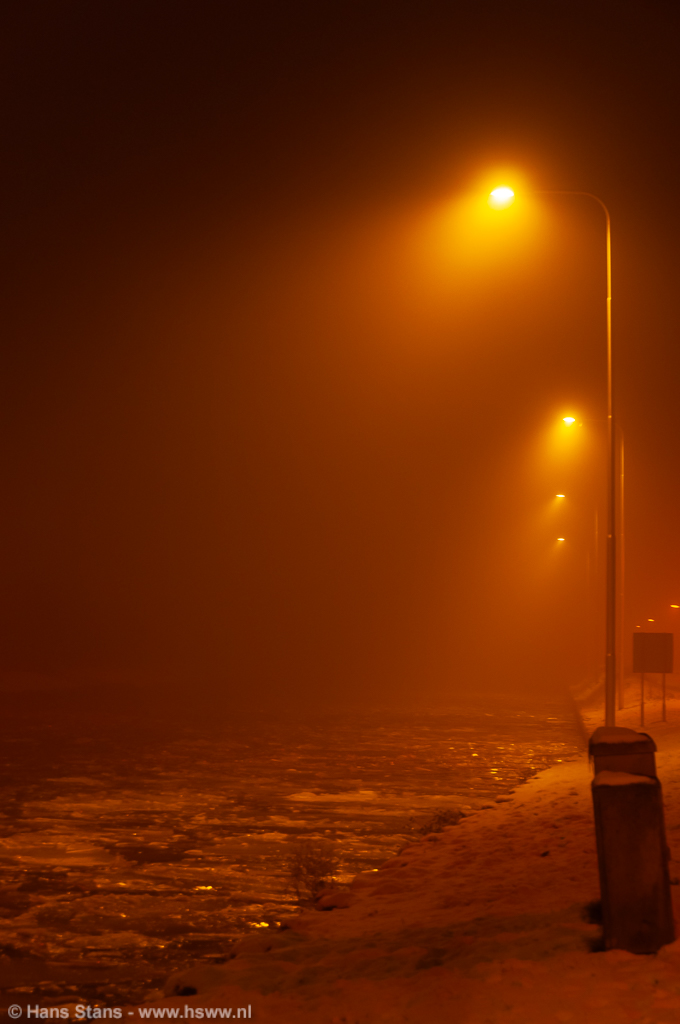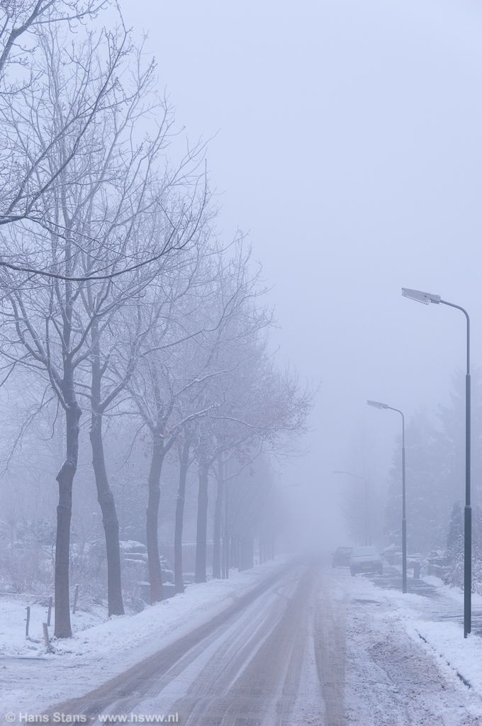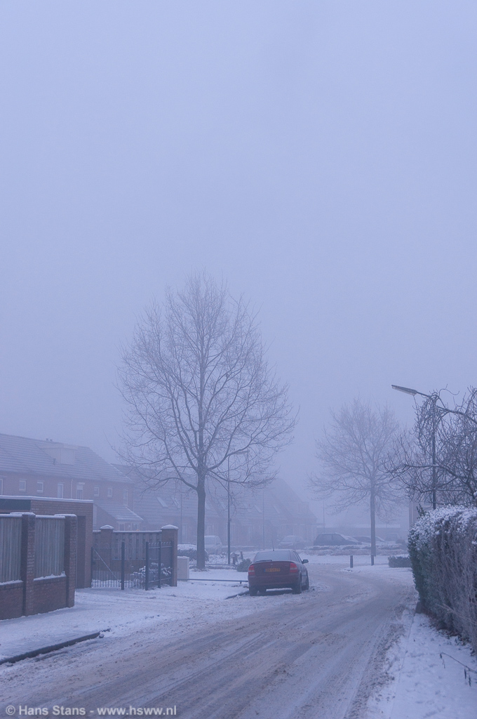 Vandaag bij vertrek naar het werk -4.0°C bij +/- 100 meter zicht, de mist sneeuwde ietwat uit (motsneeuw). Het minimum was door eerdere temperatuur na middernacht nog steeds strenge vorst en wel -10.5°C, en dat na twee nachten met zeer strenge vorst. Meer en meer rijst het besef dat dit een bijzondere winterperiode is en ik blijf daarom de sfeer vastleggen.