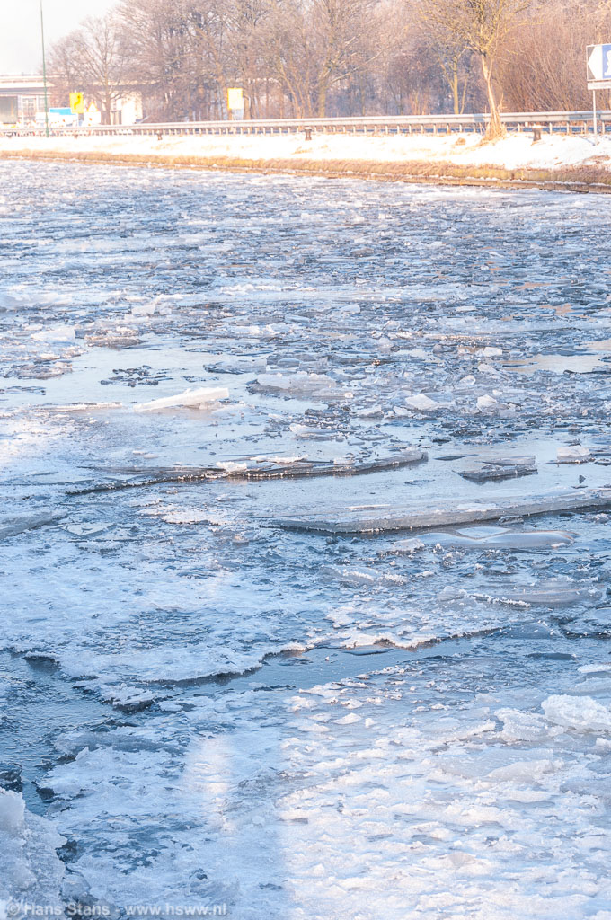 Na "gewoon" weer een nachtje strenge vorst (Tn -12.4°C) was het om kwart voor tien nog bijna 12 graden onder nul! Weerstation Eindhoven kwam afgelopen nacht zelfs (nipt) tot zeer strenge vorst -15.4°C. Ik moest naar Boekel en het is zaterdag dus op mn gemak voor de middag foto's genomen in de omgeving van Veghel, Zijtaart, en Boekel. Naar de zon toe gezien zag het er erg goudgeel uit omdat het toch nog wat heiig was, van de zon vandaan gezien was alles erg koud, blauw. Een mooi voorbeeld hiervan was de inmiddels best zware ijsgang op de Zuid-Willemsvaart ten zuiden van Veghel: