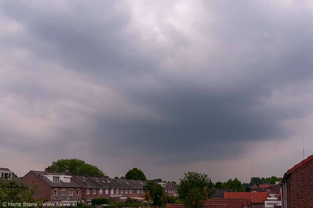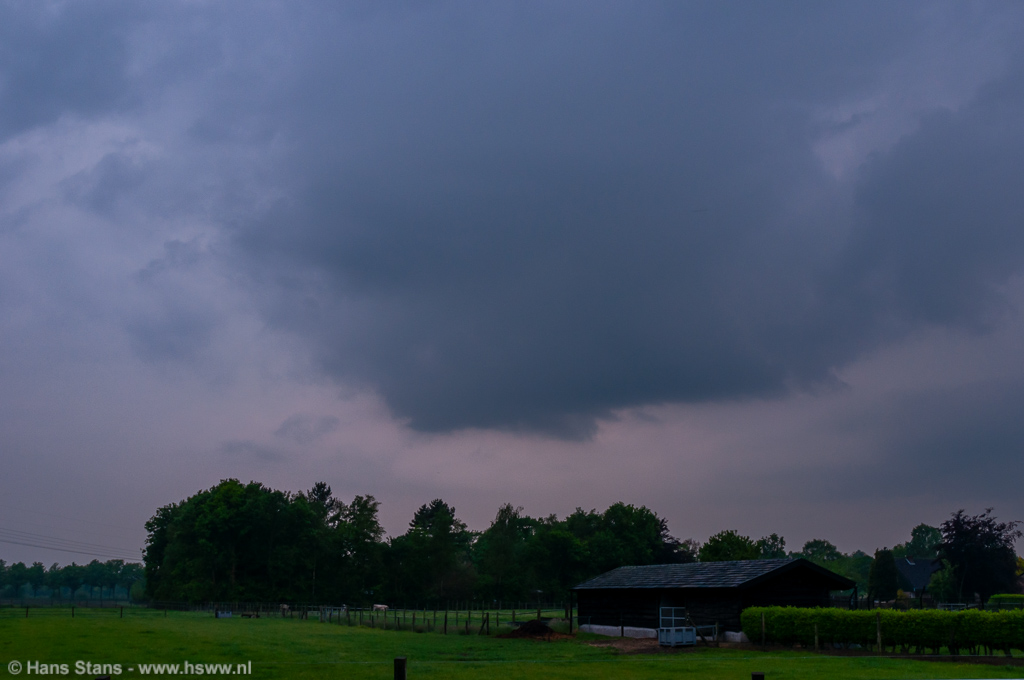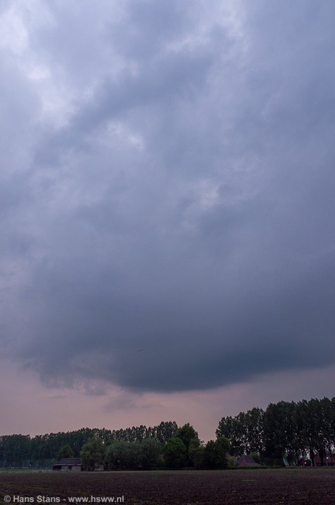 Het zag er vroeg op de avond best wel dreigend uit, echt zo'n wolkenbeeld waarbij je het spontane ontstaan van zo'n traag en kortlevend geisoleerd onweer kon verwachten, niet fotogeniek trouwens... want behoorlijk gesloten en grijs.