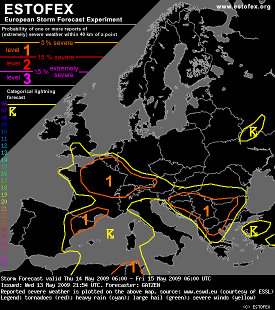 We bevonden ons deze dag in een relatief warme, vochtige en onstabiele luchtmassa. De combi van dagelijkse gang, convergentie en enige low level shear zorgden voor kans op onweersbuien. De Estofex forecaster zag er een level-1 juist iets ten zuiden van mijn regio in (de begrenzing voor mogelijk onweer omvat wel mijn streek):