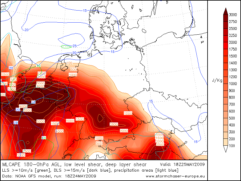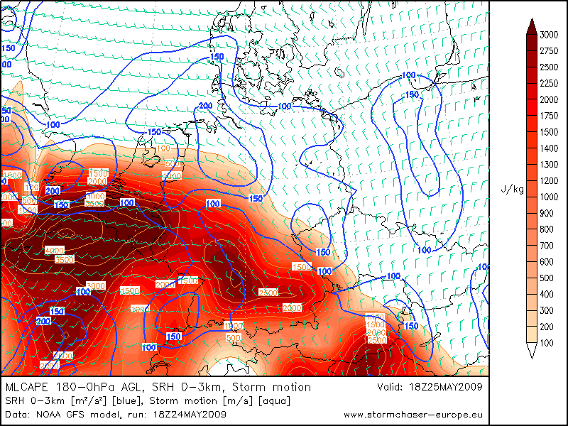 Er staat ons morgen een belangrijke onweersdag te wachten. Er is zelfs kans op - zeg maar - meerdere golven, eerst zware onweersbuien met een goede kans dat dit supercellen met hevige bijverschijnselen zullen zijn, en dan later in de nacht mogelijk meer, mogelijk een MCS. Ik heb nog geen chaseplan, e.e.a. lijkt zich uitgesproken westelijk en mogelijk voor mij te laat te gaan afspelen - moet er bijvoorbeeld naar het uiterste westen van Zeeland gegaan worden voor buien na 22:00 wordt e.e.a. voor mij slecht te doen gezien reisafstand (-tijd), ik moet de dag erop present zijn op het werk!