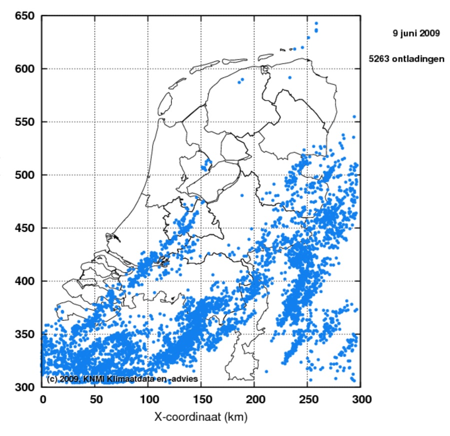 Tot slot nog het KNMI kaartje van de ontladingen voor deze dag, flink wat onweer bij onze zuiderburen, in de regio waar ik waarnam slechts een enkele ontlading: