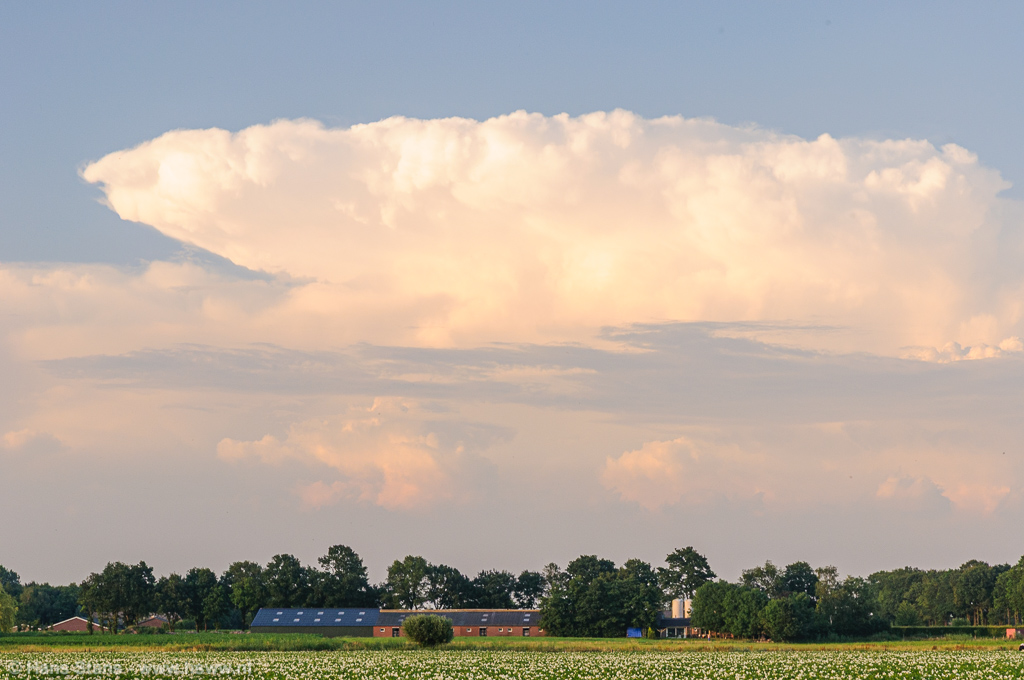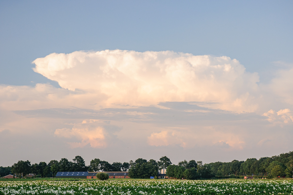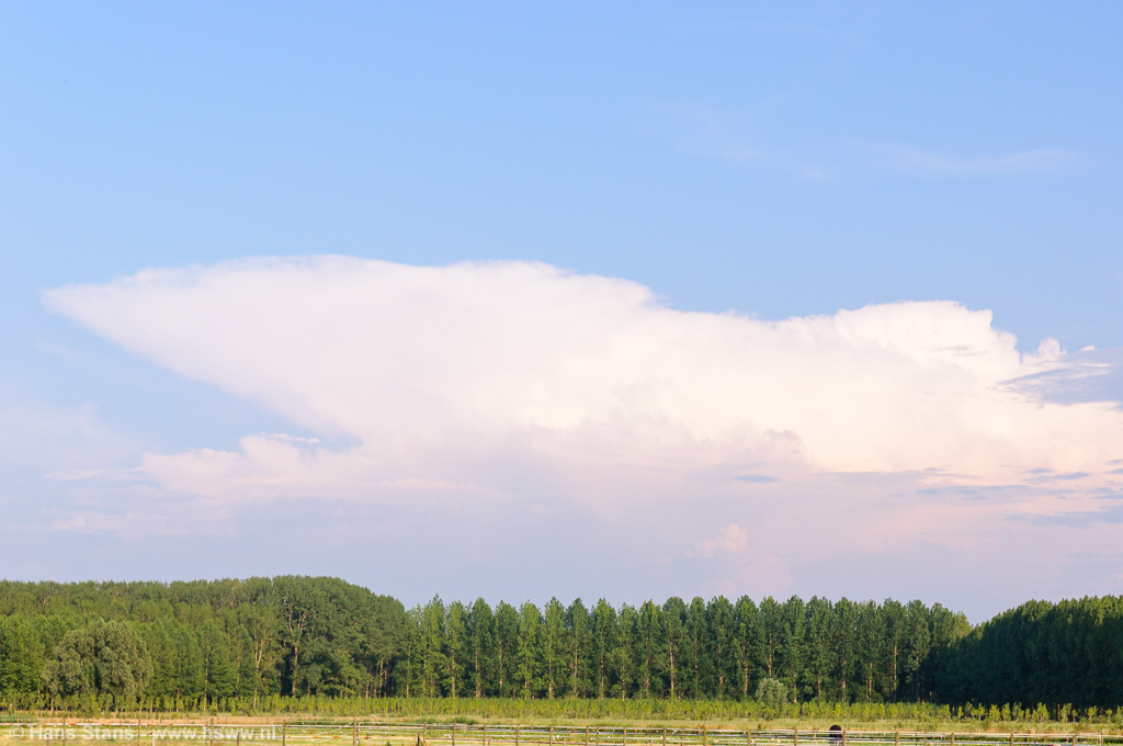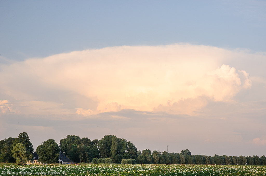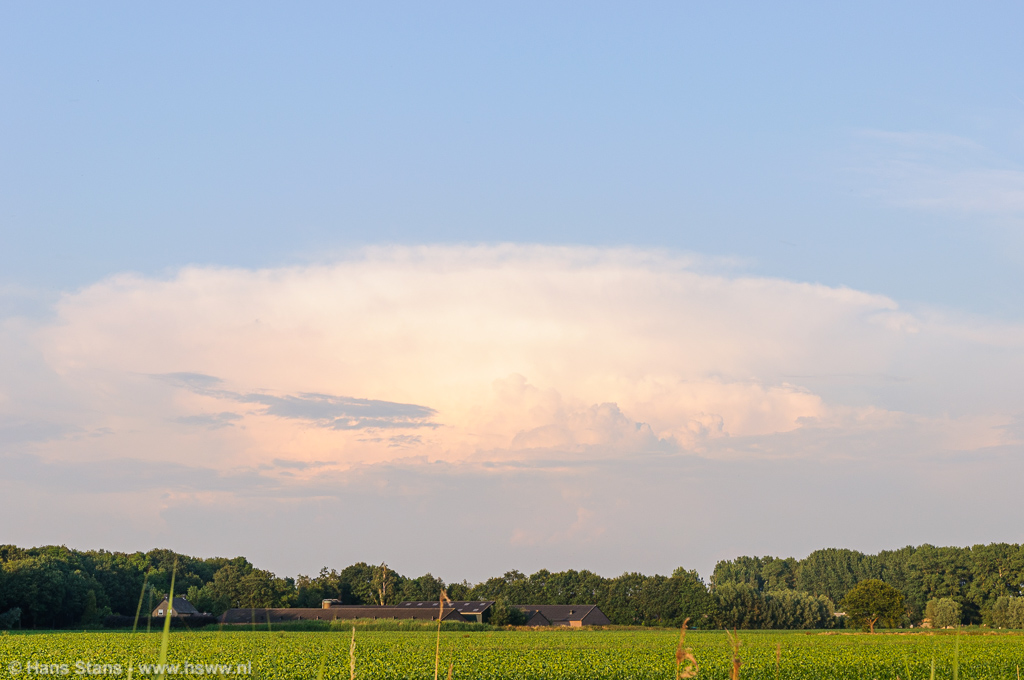 Rond 20:30 werd ik op het Weerwoord-forum door Jan uit Zaltbommel erop gewezen dat in noordelijke richting weer mooie exemplaren stonden. Ik ging kijken en inderdaad! Mooie krachtige torens kwamen omhoog, dat had ik eigenlijk niet meer verwacht zo aan het einde van de dagelijkse gang. Er op uit dus, op zoek naar een zichtpunt. Toen bleek al snel dat er wat meer oostelijk eigenlijk nog mooiere stonden.