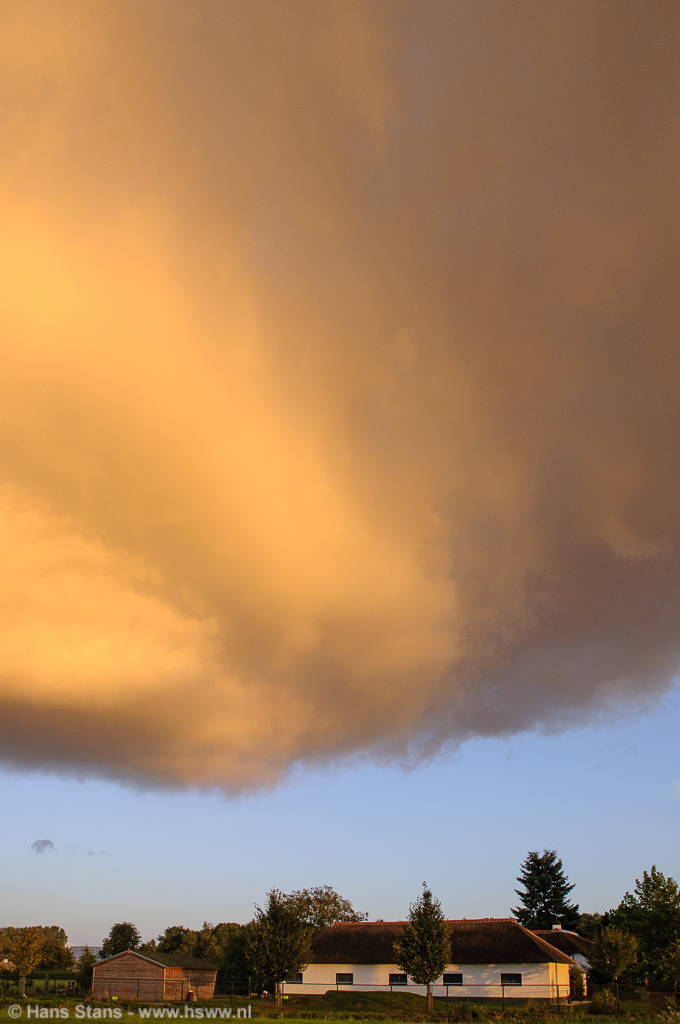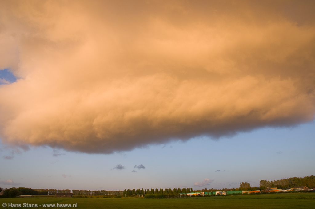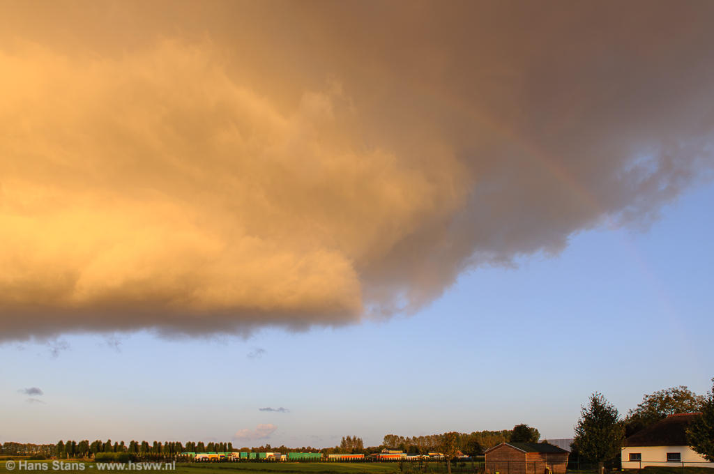Hmm, terwijl ik toekeek leek de wolkenbasis zich toch wel wat te verstevigen... Omdat ik toch graag de regenboog nog wou proberen startte ik een mini-chase. Ik reed een paar kilometer westwaarts om het nog eens te proberen, dat ritje duurde een achttal minuten, meer niet. Eenmaal ter plekke kreeg ik meteen een stuk regenboog op de foto maar schrok eigenlijk wel een beetje van hoe de wolkenbasis zich ontwikkeld had! Ook een zeer lage wolkenbasis en het geheel werd onwerkelijk beschenen door de laagstaande zon.
