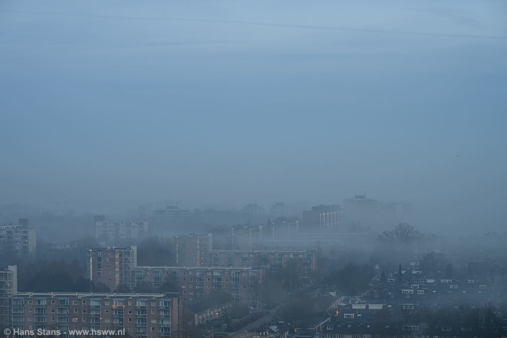 Behoorlijk mistig begin vandaag, de foto hierboven maakte ik om 08:30. Nog wat donker voor een foto uit de hand vond ik (ISO to the rescue...) dus wat later, rond 09:30 foto's gemaakt in zowel ZO als NW richting, zie hieronder. De mistlaag was niet zo dik (=hoog), gebouwen vanaf +/- 45 meter hoogte kwamen er flink ver bovenuit. Daarboven opklaringen, de zon kwam te voorschijn en de mist was vrij snel, zo rond 11:00, opgeruimd.