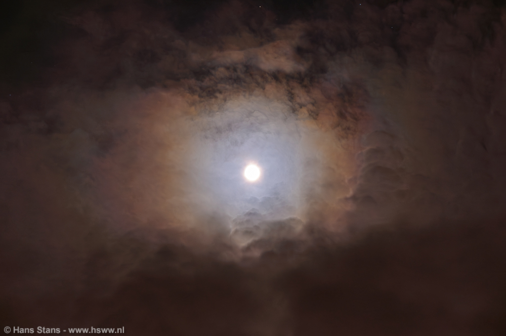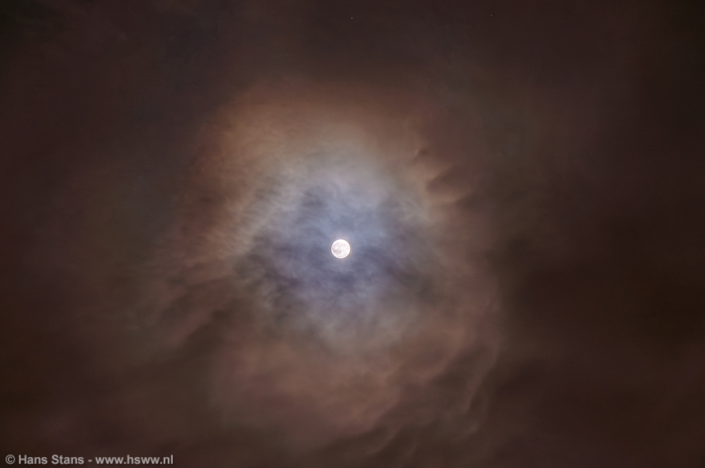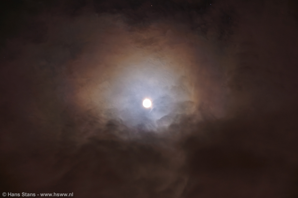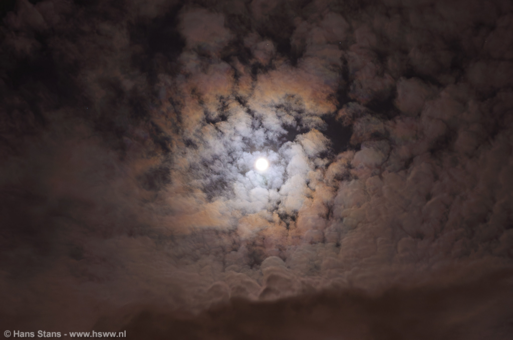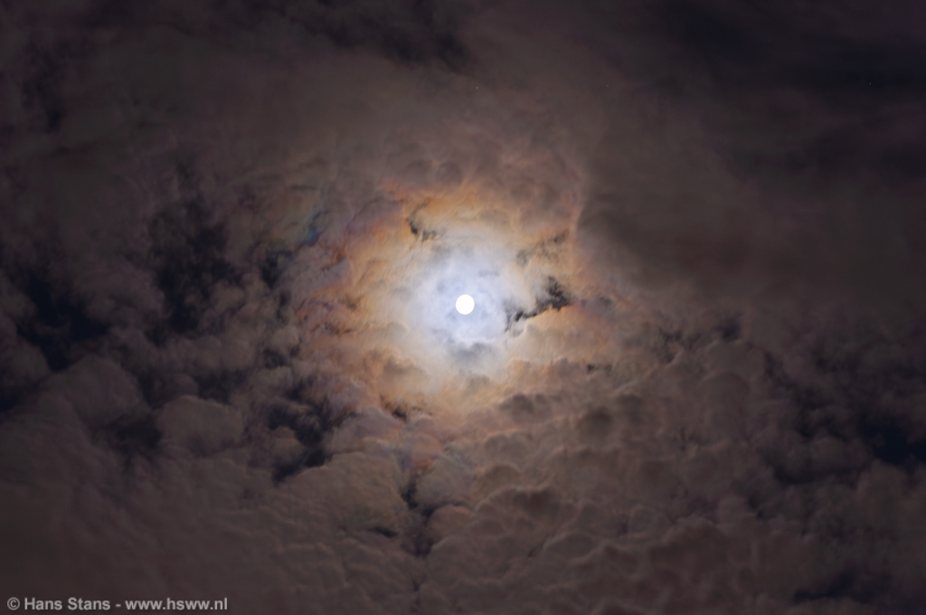 Fraaie irisaties (corona) bij de maan vanavond, wel werd de bewolking al snel wat dikker en moest er langer belicht werden waardoor het maanbeeld zelf overbelicht wordt. Nikon D90 met 18-70 kitlens, 0.6-0.8 seconden, ISO200, 50mm.